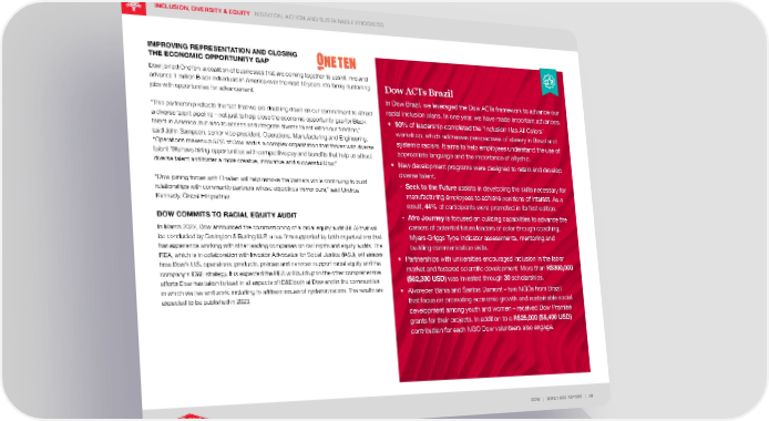 INCLUSION, DIVERSITY & EQUITY INTENTION, ACTION AND SUSTAINABLE PROGRESS DOW | 2021 ESG REPORT | 59 IMPROVING REPRESENTATION AND CLOSING THE ECONOMIC OPPORTUNITY GAP Dow joined OneTen, a coalition of businesses that are coming together to upskill, hire and advance 1 million Black individuals in America over the next 10 years into family-sustaining jobs with opportunities for advancement. “This partnership reflects the fact that we are doubling down on our commitment to attract a diverse talent pipeline – not just to help close the economic opportunity gap for Black talent in America, but also to access and integrate diverse talent within our function,” said John Sampson, senior vice president, Operations, Manufacturing and Engineering, “Operations makes up 57% of Dow and is a complex organization that thrives with diverse talent. We have hiring opportunities with competitive pay and benefits that help us attract diverse talent and foster a more creative, innovative and successful Dow.” “Dow joining forces with OneTen will help remove the barriers while continuing to build relationships with community partners whose objectives mirror ours,” said Undrea Kennedy, Global HR partner. DOW COMMITS TO RACIAL EQUITY AUDIT In March 2022, Dow announced the commissioning of a racial equity audit (REA) that will be conducted by Covington & Burling LLP, a law firm supported by both organizations that has experience working with other leading companies on civil rights and equity audits. The REA, which is in collaboration with Investor Advocates for Social Justice (IASJ), will assess how Dow’s U.S. operations, products, policies and services support racial equity and the company’s ID&E strategy. It is expected the REA will build upon the other comprehensive efforts Dow has taken to lead in all aspects of ID&E both at Dow and in the communities in which we live and work, including to address issues of systemic racism. The results are expected to be published in 2023. Dow ACTs Brazil In Dow Brazil, we leveraged the Dow ACTs framework to advance our racial inclusion plans. In one year, we have made important advances. • 90% of leadership completed the “Inclusion Has All Colors” workshop, which addresses perspectives of slavery in Brazil and systemic racism. It aims to help employees understand the use of appropriate language and the importance of allyship. • New development programs were designed to retain and develop diverse talent. - Seek to the Future assists in developing the skills necessary for manufacturing employees to achieve positions of interest. As a result, 44% of participants were promoted in its first edition. - Afro Journey is focused on building capabilities to advance the careers of potential future leaders of color through coaching, Myers-Briggs Type Indicator assessments, mentoring and building communication skills. • Partnerships with universities encouraged inclusion in the labor market and fostered scientific development. More than R$300,000 ($62,300 USD) was invested through 30 scholarships. • Alvorecer Bahia and Santos Dumont – two NGOs from Brazil that focus on promoting economic growth and sustainable social development among youth and women – received Dow Promise grants for their projects. In addition to a R$25,000 ($5,400 USD) contribution for each NGO Dow volunteers also engage.
