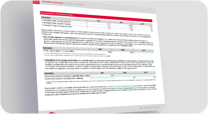 REPORTING & DISCLOSURE TRACKING OUR PROGRESS DOW | REPORTING & DISCLOSURE | 193 Dow Disclosures – TCFD Disclosure Report Description 2021 2020 2019 % renewable power, of power purchased 27% 25% 22% % renewable power, of power consumed 15% 14% 13% % renewable energy, of energy consumed 2% 2% 2% Dow’s products and services are a key component of Dow’s climate strategy as they provide an opportunity to enable the transition to a low-carbon economy. Dow has two metrics to track progress that assess our innovation and product portfolios. These are evolving metrics and we will continue to advance our approach to ensure progress and transparency. • R&D Portfolio alignment to sustainability (%): Our innovation portfolio and its alignment to our climate and other sustainability priorities is critical for achieving our sustainability goals. We have developed and implemented an approach that documents the primary alignment of each innovation project to Dow’s sustainability priorities. The approach uses a rigorous and well-defined process that includes training, review and approval of the data, as well as an annual evaluation to drive improvement. 2021 was the second year for the evaluation approach and we will continue to evolve to ensure alignment of innovation with our sustainability priorities. Description 2021 1 2020 2 2019 % R&D portfolio alignment to sustainability >85% >80% 1 Innovation projects are aligned to Dow’s sustainability focus areas and provide a sustainability benefit over incumbent approaches (2021). 2 Innovation projects are aligned to Dow’s sustainability focus areas: climate protection, circular economy, stop the waste and safer materials (2020). • Sustainability-driven revenue opportunities: Dow’s materials science solutions enable several markets and applications where sustainability is the key growth driver. Often characterized by a double-digit compound annual growth rate, these applications are fueled by commitments of consumers, private sector and governments to support the transition to a lower-carbon and more circular economy. Some examples of new or growing markets that are driven by sustainability include, but are not limited to: green buildings and climate change adaptation, e-mobility, renewable energy generation, recycling and food preservation. Dow’s businesses identify products in their portfolios that help enable such applications and report respective revenues at a market segment level. The table below supplies the 2021 aggregated ratio: Description 2021 1 2020 2019 Revenue from products that enable sustainability-driven markets 43% Revenue from products that address world challenges 48% 48% 1 The definition of this metric has been updated for 2021 and is not able to be applied to prior years. In 2021 we collected revenue from products that enable sustainability-driven markets. In 2020 and 2019, we captured revenue from products that address world challenges. Dow’s products sold into sustainability-driven applications are crucial building blocks (see Innovating low-carbon materials and technologies ); however, they often have similar characteristics to competing products or a business-as-usual level of performance. Work is underway to start reporting separately revenues of those products that are better for the planet and people across their life cycle compared with incumbent solutions. Examples include low-carbon materials, products with recycled and bio-content, solutions enabling recycling, biodegradable products and materials that are safer than incumbents.