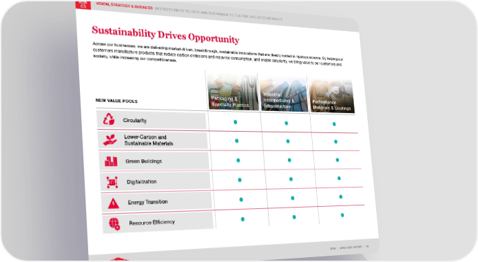 VISION, STRATEGY & BUSINESS INTERSECTION OF SCIENCE AND SUSTAINABILITY, CULTURE AND ACCOUNTABILITY DOW | 2021 ESG REPORT | 12 Sustainability Drives Opportunity Across our businesses, we are delivering market-driven, breakthrough, sustainable innovations that are deeply rooted in rigorous science. By helping our customers manufacture products that reduce carbon emissions and resource consumption, and enable circularity, we bring value to our customers and society, while increasing our competitiveness. Circularity Lower-Carbon and Sustainable Materials Green Buildings Digitalization Energy Transition Resource Efficiency Industrial Intermediates & Infrastructure Performance Materials & Coatings NEW VALUE POOLS Packaging & Specialty Plastics