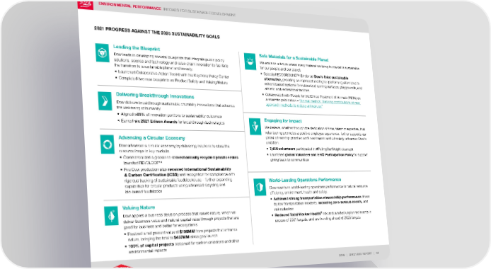 ENVIRONMENTAL PERFORMANCE INROADS FOR SUSTAINABLE DEVELOPMENT DOW | 2021 ESG REPORT | 34 2021 PROGRESS AGAINST THE 2025 SUSTAINABILITY GOALS Leading the Blueprint Delivering Breakthrough Innovations Advancing a Circular Economy Valuing Nature World-Lead ing Operations Performance Eng agin g for Impact Communitie s, Employee s, Customer s Safe Materials for a Sustainable Planet World-Leading Operations Performance Dow maintains world-leading operations performance in natural resource efficiency, environment, health and safety. • Achieved strong transportation stewardship performance driven by low transportation incidents, including zero serious events, and risk reduction • Reduced Total Worker Health ® risk and avoided unplanned events in excess of 2021 targets, and are trending ahead of 2025 targets Safe Materials for a Sustainable Planet We envision a future where every material we bring to market is sustainable for our people and our planet. • Selected ECOGROUND™ Binder as Dow’s third sustainable alternative, providing an improved and higher-performing alternative to solvent-based systems for rubberized running surfaces, playgrounds, and athletic and recreational facilities • Collaborated with People for the Ethical Treatment of Animals (PETA) on a scientific publication – “Animal metrics: Tracking contributions of new approach methods to reduce animal use” Advancing a Circular Economy Dow advances a circular economy by delivering solutions to close the resource loops in key markets. • Commercialized a global line of mechanically recycled plastic resins branded REVOLOOP™ • Five Dow production sites received International Sustainability & Carbon Certification (ICSS) and recognition for compliance with rigorous tracking of sustainable feedstocks use – further expanding capabilities for circular products using advanced recycling and bio-based feedstocks Engaging for Impact We believe, whether through the dedication of time, talent or expertise, that volunteering promotes a positive employee experience, further supports our global citizenship priorities and investments and ultimately, advances Dow’s ambition. • 7,485 volunteers participated in #PullingOurWeight cleanups • Launched global Volunteer and ERG Participation Policy to support giving back to communities Valuing Nature Dow applies a business decision process that values nature, which will deliver business value and natural capital value through projects that are good for business and better for ecosystems. • Realized a net present value of $106MM from projects that enhance nature, bringing the total to $637MM since goal launch • 100% of capital projects screened for carbon emissions and other environmental impacts Delivering Breakthrough Innovations Dow delivers breakthrough sustainable chemistry innovations that advance the well-being of humanity. • Aligned >85% of innovation portfolio to sustainability outcomes • Earned six 2021 Edison Awards for breakthrough technologies Leading the Blueprint Dow leads in developing societal blueprints that integrate public policy solutions, science and technology and value chain innovation to facilitate the transition to a sustainable planet and society. • Launched Collaborative Action Toolkit with the Keystone Policy Center • Completed two new blueprints on Product Safety and Valuing Nature