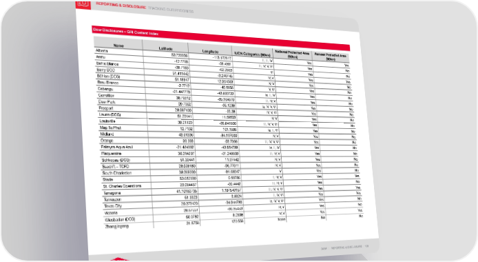 REPORTING & DISCLOSURE TRACKING OUR PROGRESS DOW | REPORTING & DISCLOSURE | 138 Dow Disclosures – GRI Content Index Name Latitude Longitude IUCN Categories (50km) National Protected Area (50km) Ramsar Protected Area (50km) Alberta 53.733936 -113.172617 II, III, IV Ye s Ye s Aratu -12.7765 -38.4981 III, IV, V, VI Ye s No Bahia Blanca -38.7183 -62.2663 VI Ye s No Barry DCC 51.411442 -3.240745 IV, V Ye s Ye s Böhlen (DCG) 51.18847 12.354563 IV, V Ye s No Breu Branco -3.7712 -49.5656 V, VI Ye s No Cabangu -21.447778 -43.609722 Ia, II, IV Ye s No Carrollton 38.70912 -85.104670 III, IV, V Ye s No Deer Park 29.7052 -95.1238 Ia, IV, V, VI Ye s No Freeport 28.987400 -95.38 IV, V, VI Ye s No Leuna (DCG) 51.29141 11.98593 IV, V Ye s No Louisville 38.21129 -85.841600 III, IV, V, VI Ye s No Map Ta Phut 12.7132 101.1686 Ia, II, VI Ye s No Midland 43.61396 -84.197600 IV, V Ye s No Orange 30.093 -93.7366 III, IV, V, VI Ye s No Palmyra Aqua Azul -21.464002 -43.554788 Ia, II, IV Ye s No Plaquemine 30.314207 -91.240608 III, IV, V Ye s No Schkopau (DCG) 51.39441 11.97442 IV, V Ye s No Seadrift – TCFD 28.508180 -96.77611 IV, V Ye s No South Charleston 38.368090 -81.68547 V Ye s No Stade 53.652090 9.50786 II, IV, V Ye s Ye s St. Charles Operations 29.984457 -90.4442 III, IV, V Ye s No Tarragona 41.10182735 1.187549157 III, IV, V, VI Ye s Ye s Terneuzen 51.3323 3.8324 II, IV, VI Ye s Ye s Texas City 29.379120 -94.944780 Ia, IV, V, VI Ye s No Victoria 28.67551 -96.95453 IV, V Ye s No Wiesbaden (DCG) 50.0782 8.2398 IV, V Ye s Ye s Zhangjiagang 31.8756 120.556 None No No