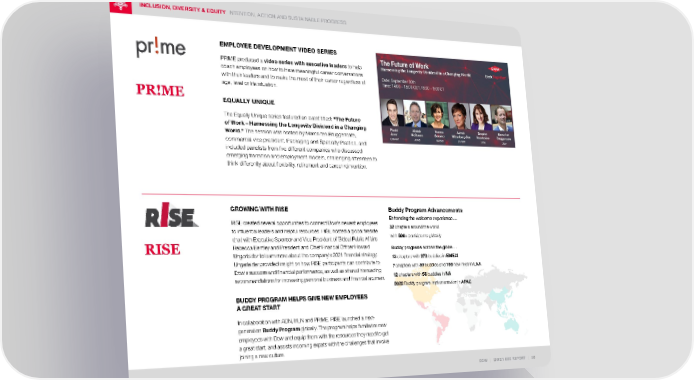 EMPLOYEE DEVELOPMENT VIDEO SERIES PR!ME produced a video series with executive leaders to help coach employees on how to have meaningful career conversations with their leaders and to make the most of their career regardless of age, level or life situation. EQUALLY UNIQUE The Equally Unique series featured an event titled: “The Future of Work – Harnessing the Longevity Dividend in a Changing World.” The session was hosted by Marco ten Bruggencate, commercial vice president, Packaging and Specialty Plastics, and included panelists from five different companies who discussed emerging transition and employment models, challenging attendees to think differently about flexibility, retirement and career reinvention. DOW | 2021 ESG REPORT | 50 INCLUSION, DIVERSITY & EQUITY INTENTION, ACTION AND SUSTAINABLE PROGRESS GROWING WITH RISE RISE created several opportunities to connect Dow’s newest employees to influential leaders and helpful resources. RISE hosted a global fireside chat with Executive Sponsor and Vice President of Global Public Affairs Rebecca Bentley and President and Chief Financial Officer Howard Ungerleider to learn more about the company’s 2021 financial strategy. Ungerleider provided insight on how RISE participants can contribute to Dow’s success and financial performance, as well as shared his reading recommendations for increasing personal business and financial acumen. BUDDY PROGRAM HELPS GIVE NEW EMPLOYEES A GRE AT START In collaboration with ADN, HLN and PR!ME, RISE launched a next- generation Buddy Program globally. The program helps familiarize new employees with Dow and equip them with the resources they need to get a great start, and assists incoming expats with the challenges that involve joining a new culture. Buddy Program Advancements PR!ME RISE Enhancing the welcome experience ... 32 chapters around the world with 500+ participants globally Buddy programs across the globe ... 13 chapters with 272 buddies in EMEAI 7 chapters with 80 buddies and 100 new hires in LAA 12 chapters with 58 buddies in NA 2022 Buddy program implementation in APAC