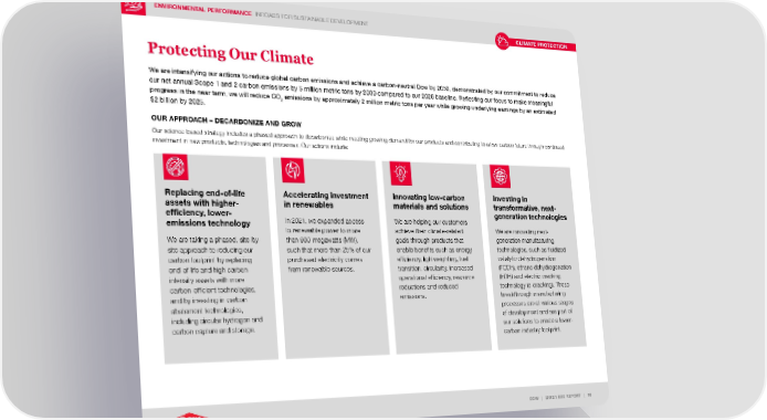 ENVIRONMENTAL PERFORMANCE INROADS FOR SUSTAINABLE DEVELOPMENT DOW | 2021 ESG REPORT | 16 Protecting Our Climate We are intensifying our actions to reduce global carbon emissions and achieve a carbon-neutral Dow by 2050, demonstrated by our commitment to reduce our net annual Scope 1 and 2 carbon emissions by 5 million metric tons by 2030 compared to our 2020 baseline. Reflecting our focus to make meaningful progress in the near term, we will reduce CO 2 emissions by approximately 2 million metric tons per year while growing underlying earnings by an estimated $2 billion by 2025. OUR APPROACH – DECARBONIZE AND GROW Our science-based strategy includes a phased approach to decarbonize while meeting growing demand for our products and contributing to a low-carbon future through continued investment in new products, technologies and processes. Our actions include: Replacing end-of-life assets with higher- efficiency, lower- emissions technology We are taking a phased, site-by- site approach to reducing our carbon footprint by replacing end-of-life and high carbon- intensity assets with more carbon-efficient technologies, and by investing in carbon abatement technologies, including circular hydrogen and carbon capture and storage. Accelerating investment in renewables In 2021, we expanded access to renewable power to more than 900 megawatts (MW), such that more than 25% of our purchased electricity comes from renewable sources. Innovating low-carbon materials and solutions We are helping our customers achieve their climate-related goals through products that enable benefits such as energy efficiency, lightweighting, fuel transition, circularity, increased operational efficiency, resource reductions and reduced emissions. Investing in transformative, next- generation technologies We are innovating next- generation manufacturing technologies, such as fluidized catalytic dehydrogenation (FCDh), ethane dehydrogenation (EDH) and electric cracking technology (e-cracking). These breakthrough manufacturing processes are at various stages of development and are part of our solutions to create a lower- carbon industry footprint. CLIMATE PROTECTION