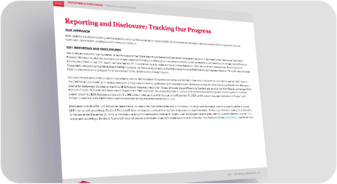REPORTING & DISCLOSURE TRACKING OUR PROGRESS DOW | REPORTING & DISCLOSURE | 87 Reporting and Disclosure: Tracking Our Progress OUR APPROACH Dow leads the industry in reporting and transparency since our first sustainability report in 2003. We aim to provide transparent disclosures as a tool for engagement with our customers, stockholders, employees and community members. 2021 REPORTING AND DISCLOSURES We continued to build on our foundation of reporting against the Global Reporting Initiative (GRI) Standards Comprehensive option in alignment to the Greenhouse Gas (GHG) Protocol. We have included disclosures on our climate-related performance and strategies in accordance with the recommendations of the Task Force on Climate-related Financial Disclosures (TCFD). In our 2021 report, we have met our 2017 commitment to fully implement the recommendations of TCFD. We continue to reference our disclosures to the Sustainability Accounting Standards Board (SASB) metrics for the chemical sector and the World Economic Forum’s (WEF) Stakeholder Capitalism Metrics. The report also serves as Dow’s communication on progress for its commitment to the United Nations Global Compact. We prepared and presented our report in accordance with the GRI Standards Comprehensive option and the GHG information is presented in accordance with the GHG Protocol. The GHG Protocol is made up of multiple standards: A Corporate Accounting and Reporting Standard (Revised Edition) published by the World Resources Institute/World Business Council for Sustainable Development and the GHG Protocol: Corporate Value Chain (Scope 3) Accounting and Reporting Standard published by the World Resources Institute/World Business Council for Sustainable Development (together the “GHG Protocol”). We engaged Deloitte & Touche LLP to perform a review engagement on management’s assertion related to both the ESG disclosures included in the GRI Content Index as of, and for the year ended December 31, 2021, and the greenhouse gas disclosures for Scope 1 and Scope 2 Emissions in the GHG Protocol Disclosure Report for the year ended December 31, 2021. Information outside of the ESG disclosures referenced or included in the GRI Content Index and GHG Protocol, including linked information, was not subject to Deloitte & Touche LLP’s review and, accordingly, Deloitte & Touche LLP does not express a conclusion or any form of assurance on such information. Further, any information relating to periods prior to the year ended December 31, 2020, or information relating to forward-looking statements, targets, goals and progress against goals, was not subject to Deloitte & Touche LLP’s review and, accordingly, Deloitte & Touche LLP does not express a conclusion or any form of assurance on such information. See Deloitte’s GRI and GHG Protocol reports as linked.