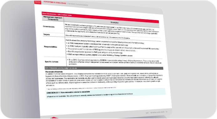REPORTING & DISCLOSURE TRACKING OUR PROGRESS DOW | REPORTING & DISCLOSURE | 121 Dow Disclosures – GRI Content Index Management Approach Components Description Commitments We are committed to achieving at least a 1% year-over-year improvement in our RME index from a 2015 baseline every year until 2025. It is expected that most technologies will have defined activities and goals around RME, but it is understood that optimizing RME for some technologies may not be a critical profitability metric based on their current performance against theoretical best. The key is that each technology organization understands the opportunity and utilizes the information in annual goal planning. Targets Dow will improve its raw material efficiency utilization index by 10% relative to the 2015 baseline. Responsibilities Each Business Manufacturing Technology Leader is expected to ensure the following actions occur for their technology: • An RME measurement system is developed that is meaningful to the particular technology. • An RME focal point (typically called Yield Focal Point) is assigned that can work with the plants to understand the potential RME opportunities. • The economics and financial value of RME opportunities or gaps are determined and value is tracked. • Each Envelope Leader approves the RME goals and plans set by the technology. • RME savings is tracked quarterly, aligned to Innovative Technology Strategy Operations element. Specific Actions • Since 2015, Dow has enabled approximately $300MM in raw materials savings through efficiency improvements. These savings are primarily attributed to effective catalyst management across several technologies, reliable operations leading to minimized flaring and reduced natural gas purchases. 301-1 Materials used by weight or volume Renewable Materials In addition to fossil-based resources, Dow employs renewable raw materials based on wood, sugar cane, corn, grains and vegetable oils, among others, preferentially as byproducts from other industrial processes. In 2021, Dow purchased approximately 420KT* of renewable materials . These materials are used across a large portfolio of products across our businesses. The renewable raw materials are also used to directly substitute fossil-based resources using the mass balance approach, allowing us to allocate renewables in a wide variety of products. Dow works closely with our suppliers to ensure that our renewable raw materials are ethically sourced and do not come with negative effects such as deforestation, displacing local communities or harm to biodiversity, while expanding the positive gains such as – for example – reduction in greenhouse gas emissions. * New methodology and data capture has been deployed providing 420KT as the minimum number of renewable materials identified in 2021. OMISSION 301-1 Non-renewable volume is unavailable Information not available. We will continue to annually assess mechanisms to be able to report this information in the future.