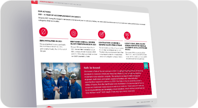 HEALTH & SAFETY INTEGRATING SAFETY INTO ALL WE DO DOW | 2021 ESG REPORT | 37 OUR ACTIONS 2021 – A YEAR OF ACCOMPLISHMENTS IN SAFETY Despite 2021 being the largest maintenance turnaround year in company history, we were able to achieve some of our best-ever safety performance in several categories that we monitor. A MULTI-YEAR, ZERO-INJURY STREAK FOR MOTOR VEHICLE ACCIDENTS (MVA s) CONTINUED IN 2021 Zero severe MVAs occurred at a Dow site in 2021. This is our longest and best streak, with the most recent severe MVA recorded more than two years ago. BEST-EVER OVERALL SEVERE INJURY PERFORMANCE IN 2021 We went 281 days severe injury-free in 2021. We recorded one severe injury in 2021, compared to six incidents in 2020 and 34 in 2015, when we initially launched our 2025 Sustainability Goals. CONTRACTORS ACHIEVED A SEVERE INJURY-FREE STREAK Our contractors were free of severe injuries for 526 days, as of December 31, 2021. The North America Contractor Safety Task Force helped sustain this notable streak, which is the longest in company history. ZERO FATALITIES IN 2021 We accomplished the one-year fatality- free milestone on March 30, 2021, and remained fatality-free for the rest of the ye a r. Safe in Sound We hosted a Safe in Sound webcast in 2021 to highlight the importance of reducing exposure to noise and introduced resources offered by Dow to help successfully implement noise reduction projects. The audience included EHS&S colleagues, engineers, technicians and leaders aligned to facilities with noise reduction opportunities targeted to achieve by 2025. The Safe in Sound panel discussed a variety of topics, from the identification and prioritization of noise sources to how to scope and implement noise exposure reduction solutions. These sessions were key to driving awareness and leveraging proven solutions, which will help us achieve our Total Worker Health ® 2025 target of reducing high-priority noise risks.