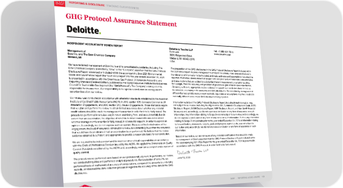 REPORTING & DISCLOSURE TRACKING OUR PROGRESS DOW | REPORTING & DISCLOSURE | 183 GHG Protocol Assurance Statement Deloitte & Touche LLP Suite 400 3320 Ridgecrest Drive Midland, MI 48642-2370 USA Tel: +1 989 631 2370 www.deloitte.com INDEPENDENT ACCOUNTANTS’ REVIEW REPORT Management of Dow Inc. and The Dow Chemical Company Midland, MI We have reviewed management of Dow Inc.’s and its consolidated subsidiaries, including The Dow Chemical Company (collectively, “Dow” or the “Company”) assertion that the GHG Protocol Disclosure Report referenced or included within the accompanying Dow 2021 Environmental, Social and Governance Report (the “2021 ESG Report”) for the year ended December 31, 2021 is presented in accordance with the Greenhouse Gas Protocol: A Corporate Accounting and Reporting Standard (Revised Edition), published by the World Resources Institute/World Business Council for Sustainable Development (the “GHG Protocol”). The Company’s management is responsible for its assertion. Our responsibility is to express a conclusion on management’s assertion based on our review. Our review was conducted in accordance with attestation standards established by the American Institute of Certified Public Accountants (AICPA) in AT-C section 105, Concepts Common to All Attestation Engagements , and AT-C section 210, Review Engagements . Those standards require that we plan and perform the review to obtain limited assurance about whether any material modifications should be made to management’s assertion in order for it to be fairly stated. The procedures performed in a review vary in nature and timing from, and are substantially less in extent than an examination, the objective of which is to obtain reasonable assurance about whether management’s assertion is fairly stated, in all material respects, in order to express an opinion. Accordingly, we do not express such an opinion. Because of the limited nature of the engagement, the level of assurance obtained in a review is substantially lower than the assurance that would have been obtained had an examination been performed. We believe that the review evidence obtained is sufficient and appropriate to provide a reasonable basis for our conclusion. We are required to be independent and to meet our other ethical responsibilities in accordance with the Code of Professional Conduct issued by the AICPA. We applied the Statements on Quality Control Standards established by the AICPA and, accordingly, maintain a comprehensive system of quality control. The procedures we performed were based on our professional judgment. In performing our review, we conducted inquiries and performed analytical procedures. For a selection of amounts, we performed tests of mathematical accuracy of computations, compared the amounts to underlying records, or observed the data collection process in regard to the accuracy of the data in the GHG disclosures. The preparation of the GHG disclosures in the GHG Protocol Disclosure Report included within the 2021 ESG Report requires management to interpret the criteria, make determinations as to the relevancy of information to be included, and make estimates and assumptions that affect the reported information. Measurement of Scope 1 and Scope 2 GHG emissions includes estimates and assumptions that are subject to substantial inherent measurement uncertainty resulting, for example, from the accuracy and precision of greenhouse gas emission conversion factors. Obtaining sufficient, appropriate review evidence to support our conclusion does not reduce the inherent uncertainty in the amounts and GHG disclosures. The selection by management of different but acceptable measurement methods, input data or assumptions may have resulted in materially different amounts or GHG disclosures being reported. Information outside of the GHG Protocol Disclosure Report, including linked information, was not subject to our review, including the Alignment to U.N. Sustainable Development Goals, TCFD Disclosure Report, SASB Disclosures Report, WEF Disclosure Report, and Non-GAAP Financial Measures and, accordingly, we do not express a conclusion or any form of assurance on such information. Any information relating to Scope 3 was not subject to our review; and accordingly, we do not express a conclusion or any form of assurance on such information. Further, any information relating to Scope 3 and periods prior to the year ended December 31, 2021 or information relating to forward looking statements, targets, goals and progress against goals, was not subject to our review and, accordingly, we do not express a conclusion or any form of assurance on such information. Based on our review, we are not aware of any material modifications that should be made to management of Dow’s assertion that the GHG Protocol Disclosure Report included within the accompanying 2021 ESG Report for the year ended December 31, 2021 is presented in accordance with the GHG Protocol, in order for it to be fairly stated. June 15, 2022