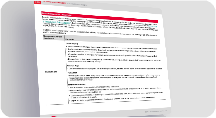 REPORTING & DISCLOSURE TRACKING OUR PROGRESS DOW | REPORTING & DISCLOSURE | 172 Dow Disclosures – GRI Content Index Engaging suppliers that prioritize social issues is important. We select and manage suppliers based on a robust set of criteria ranging from performance and economics to ESG factors. In the reporting year, all new suppliers were engaged on ESG factors through data collection, policies, and guidelines like the Supplier Code of Conduct ( Supplier Code of Conduct| Public Policy | Corporate ). The Supplier Code of Conduct stipulates requirements related to social responsibility including Respect Freedom of Association and Collective Bargaining, No Forced and Compulsory Labor, No Harassment and Abuse of Labor, No Child Labor, No Discrimination, Supplier Diversity, Appropriate Work Hours and Wages, and No Conflict Minerals Sourcing. In addition, some Dow procurement selection processes include additional social criteria related to a certain sector or commercial area. Beginning in 2022, ESG criteria will be used for all sourcing decisions. Management Approach Components Description Commitments Gender Pay Gap • Dow is committed to making continued progress in several key areas to advance gender equity and further develop our female talent pipeline • Dow is committed to correcting underlying disparities through pay audits and annual compensation reviews that factor in how we set pay (education, experience, responsibilities and performance). • We are also committed to looking beyond wages to examine bonuses, stock awards, promotion rates and concentration levels by gender in certain jobs. • Dow also looks to eliminate bias in hiring through unconscious-bias training (i.e., inclusive hiring standard, inclusive job descriptions, unconscious bias training and inclusive leadership training). Minimum Wage • Dow is committed to worker prosperity. We are investing in workforce, education and skills training to create economic opportunity for all workers. Immigration • Dow supports the rule of law. Immigration policies should make borders secure while also reflecting the realities of the 21st century economy. It must help build a diverse workforce that allows companies to serve global customers, compete in new markets and leverage different perspectives that fuel innovation. Environmental Justice • Dow is committed to ensuring the health and safety of our communities. • No community should bear an adverse environmental or health outcome as a result of our operations. We do not operate our sites to different standards based on who our neighbors are. • Dow has long been committed to exceeding our own ambitious sustainability goals, and we work closely with the appropriate regulatory bodies to meet or out-perform all standards. • As part of a similar longstanding commitment, Dow listens to our communities — their concerns, their questions and their needs.