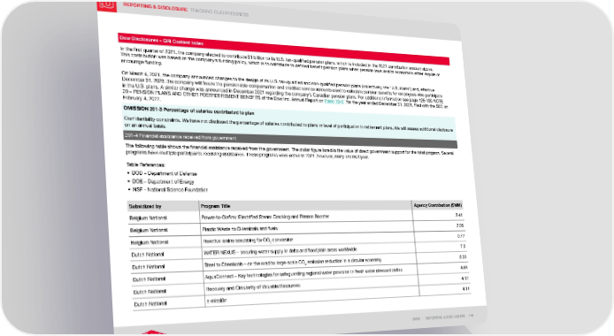 REPORTING & DISCLOSURE TRACKING OUR PROGRESS DOW | REPORTING & DISCLOSURE | 115 Dow Disclosures – GRI Content Index In the first quarter of 2021, the company elected to contribute $1 billion to its U.S. tax-qualified pension plans, which is included in the 2021 contribution amount above. This contribution was based on the company’s funding policy, which is to contribute to defined benefit pension plans when pension laws and/or economics either require or encourage funding. On March 4, 2021, the company announced changes to the design of its U.S. tax-qualified and non-qualified pension plans (collectively, the “U.S. Plans”) and, effective December 31, 2023, the company will freeze the pensionable compensation and credited service amounts used to calculate pension benefits for employees who participate in the U.S. plans. A similar change was announced in December 2021 regarding the company’s Canadian pension plans. For additional information see page 128-135 NOTE 20 – PENSION PLANS AND OTHER POSTRETIREMENT BENEFITS of the Dow Inc. Annual Report on Form 10-K ~ for the year ended December 31, 2021, filed with the SEC on February 4, 2022. OMISSION 201-3 Percentage of salaries contributed to plan Confidentiality constraints. We have not disclosed the percentage of salaries contributed to plans or level of participation in retirement plans. We will assess additional disclosure on an annual basis. 201-4 Financial assistance received from government The following table shows the financial assistance received from the government. The dollar figure listed is the value of direct government support for the total program. Several programs have multiple participants receiving assistance. These programs were active in 2021; however, many are multiyear. Table References: • DOD – Department of Defense • DOE – Department of Energy • NSF – National Science Foundation Subsidized by Program Title Agency Contribution ($MM) Belgium National Power-to-Olefins: Electrified Steam Cracking and Plasma Booster 3.41 Belgium National Plastic WAste to CHemicals and fuels 2.95 Belgium National Reactive amine scrubbing for CO 2 conversion 0.72 Dutch National WATER NEXUS – securing water supply in delta and floodplain areas worldwide 7.5 Dutch National Steel to Chemicals – on the road to large-scale CO 2 emission reduction in a circular economy 5.33 Dutch National AquaConnect – Key technologies for safeguarding regional water provision in fresh water stressed deltas 4.68 Dutch National Recovery and Circularity of Valuable Resources 4.12 Dutch National e-missi0n 4.11