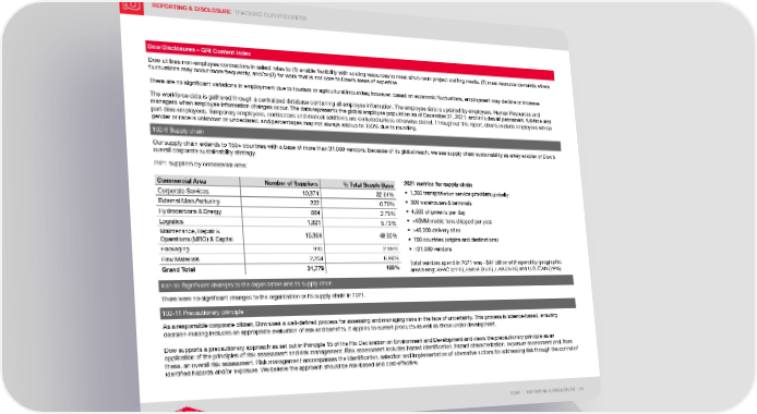 REPORTING & DISCLOSURE TRACKING OUR PROGRESS DOW | REPORTING & DISCLOSURE | 91 Dow Disclosures – GRI Content Index Dow utilizes non-employee contractors in select roles to (1) enable flexibility with scaling resources to meet short-term project staffing needs, (2) meet resource demands where fluctuations may occur more frequently, and/or (3) for work that is not core to Dow’s areas of expertise. There are no significant variations in employment due to tourism or agricultural industries; however, based on economic fluctuations, employment may decline or increase. The workforce data is gathered through a centralized database containing all employee information. The employee data is updated by employees, Human Resources and managers when employee information changes occur. The data represents the global employee population as of December 31, 2021, and includes all permanent, full-time and part-time employees. Temporary employees, contractors and manual additions are excluded unless otherwise stated. Throughout this report, charts exclude employees whose gender or race is unknown or undeclared, and percentages may not always add up to 100% due to rounding. 102-9 Supply chain Our supply chain extends to 150+ countries with a base of more than 31,000 vendors. Because of its global reach, we see supply chain sustainability as a key enabler of Dow’s overall corporate sustainability strategy. 2021 suppliers by commercial area: Commercial Area Number of Suppliers % Total Supply Base 2021 metrics for supply chain • 1,300 transportation service providers globally • 300 warehouses & terminals • 4,500 shipments per day • >45MM metric tons shipped per year • >40,000 delivery sites • 150 countries (origins and destinations) • >31,000 vendors Total vendors spend in 2021 was ~$47 billion with spend by geographic area being: APAC (21%), EMEA (35%), LAA (15%) and U.S./CAN (29%) Corporate Services 10,374 32.64% External Manufacturing 222 0.70% Hydrocarbons & Energy 884 2.78% Logistics 1,821 5.73% Maintenance, Repair & Operations (MRO) & Capital 15,364 48.35% Packaging 910 2.86% Raw Materials 2,204 6.94% Grand Total 31,779 100% 102-10 Significant changes to the organization and its supply chain There were no significant changes to the organization or its supply chain in 2021. 102-11 Precautionary principle As a responsible corporate citizen, Dow uses a well-defined process for assessing and managing risks in the face of uncertainty. This process is science-based, ensuring decision-making includes an appropriate evaluation of risk and benefits. It applies to current products as well as those under development. Dow supports a precautionary approach as set out in Principle 15 of the Rio Declaration on Environment and Development and views the precautionary principle as an application of the principles of risk assessment and risk management. Risk assessment includes hazard identification, hazard characterization, exposure assessment and, from these, an overall risk assessment. Risk management encompasses the identification, selection and implementation of alternative actions for addressing risk through the control of identified hazards and/or exposure. We believe the approach should be risk-based and cost-effective.