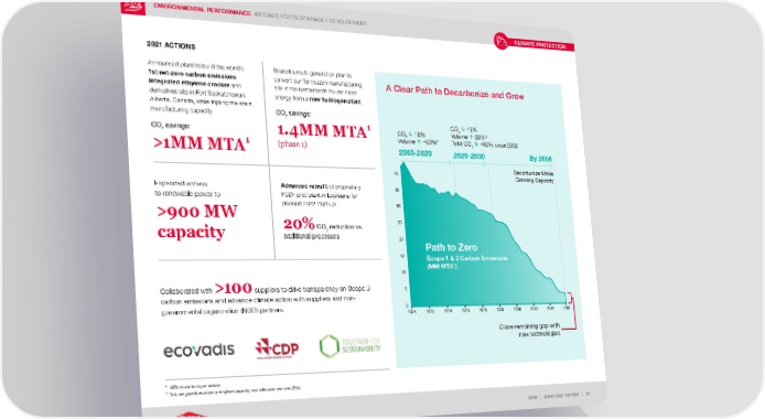 ENVIRONMENTAL PERFORMANCE INROADS FOR SUSTAINABLE DEVELOPMENT DOW | 2021 ESG REPORT | 17 2021 ACTIONS A Clear Path to Decarbonize and Grow CLIMATE PROTECTION Announced plans to build the world’s 1st net-zero carbon emissions integrated ethylene cracker and derivatives site in Fort Saskatchewan, Alberta, Canada, while tripling the site’s manufacturing capacity CO 2 savings: >1 M M M TA 1 Shared a multi-generation plan to convert our Terneuzen manufacturing site in the Netherlands to use clean energy from a new hydrogen plant CO 2 savings: 1.4MM MTA 1 (pha se 1) Expanded access to renewable power to >900 MW capacity Advanced retrofit of proprietary FCDh pilot plant in Louisiana for planned 2022 start-up 20% CO 2 reduction vs. traditional processes Collaborated with >10 0 suppliers to drive transparency on Scope 3 carbon emissions and advance climate action with suppliers and non- governmental organization (NGO) partners 0 5 10 15 20 25 30 35 40 2005 2010 2015 2020 2025 2005-2020 2030 2035 2040 2045 2050 Path to Zero Scope 1 & 2 Carbon Emissions (MM MTA 1 ) Close remaining gap with new technologies Decarbonize While Growing Capacity 2020-2030 By 2050 CO 2 15% Volume ~30% 2 CO 2 15% Volume 20% 2 Total CO 2 ~30% since 2005 1 MTA=meric tons per annum 2 Volume growth represents ethylene capacity, excludes joint ventures (JVs)