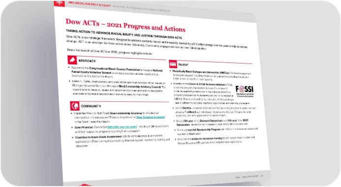 INCLUSION, DIVERSITY & EQUITY INTENTION, ACTION AND SUSTAINABLE PROGRESS DOW | 2021 ESG REPORT | 58 Dow ACTs – 2021 Progress and Actions TAKING ACTION TO ADVANCE RACIAL EQUITY AND JUSTICE THROUGH DOW ACTS Dow ACTs is our strategic framework designed to address systemic racism and inequality, backed by a $13 million pledge over five years to help accelerate change. ACT is an acronym for three action areas: Advocacy, Community engagement and our own Talent pipeline. Since the launch of Dow ACTs in 2020, progress highlights include: ADVOCACY • Supported the Congressional Black Caucus Foundation’s inaugural National Racial Equity Initiative Summit to produce equitable access, opportunities, treatment and outcomes for Blacks. • Karen S. Carter, chief Human Resources officer and chief inclusion officer, serves on Michigan Governor Gretchen Whitmer’s Black Leadership Advisory Council . The council aims to develop, review and recommend policies and actions designed to eradicate and prevent discrimination and racial inequity in Michigan. COMMUNITY • Expanded the U.S. Gulf Coast Dow Leadership Academy to include Dow communities in Louisiana and Texas and launched the Dow Treasure Academy in the Great Lakes Bay Region. • Dow Promise: Committed $600,000 over six years , resulting in 26 organizations and their respective programs receiving financial support. • Coalition to Back Black Businesses: Efforts led to 45 small, Black-owned businesses in Dow communities receiving financial support, mentorship, training and resources. TALENT • Historically Black Colleges and Universities (HBCUs): Continued engagement for program support, including investment to retain and develop Black students in STEM and build the Ph.D. talent pipeline. • Invested in the Future of STEM Scholars Initiative (FOSSI), a national program that seeks to increase the number of underrepresented professionals in the chemical industry by providing scholarships to students pursuing STEM degrees at HBCUs. Dow is underwriting the education of 10 students per year in addition to providing mentoring opportunities and internship placements. • Joined O neTen , a coalition of businesses that are coming together to upskill, hire and advance 1 million Black individuals in America over the next 10 years into family- sustaining jobs with opportunities for advancement. • Hosted 5th year of the Diamond Symposium and 15th year of the BEST Symposium , resulting in an increased number of U.S. ethnic minority hires. • Continued our AiA Sponsorship Program with Cohort 2 to drive advancement and retention of Black talent. • Implemented Advanced Inclusion Training for U.S.-based People Leaders and Human Resource (HR) partners which included racial equity topics.