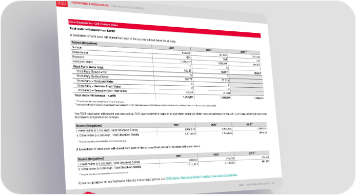 REPORTING & DISCLOSURE TRACKING OUR PROGRESS DOW | REPORTING & DISCLOSURE | 132 Dow Disclosures – GRI Content Index Total water withdrawal from KWSS: A breakdown of total water withdrawal from each of the sources is listed below for all areas. Source (Megaliters) 2021 2020 1 2019 1 Surface 119,968 187,160 247,130 Groundwater 614 358 515 Seawater 1,086,112 1,095,556 991,862 Produced Water 0 0 0 Third-Party Water Total 54,137 50,811 28,524 2 Third-Party Groundwater 0 0 Third-Party Surface Water 28,778 27,713 Third-Party – Produced Water 0 0 Third-Party – Seawater Fresh Water 0 0 Third-Party – Seawater Non-Fresh Water 25,359 23,098 Total Water Withdrawal – KWSS 1,260,831 1,333,885 1,268,031 1 The prior year data was restated by an immaterial amount. 2 Data collected in 2019 contains all purchased water including from non-freshwater sources. Methodology changes that allowed for visibility of source of third-party water started in 2020. The 2021 total water withdrawal was reduced vs. 2020 due to rainfall at major sites and winter storm Uri, which had a broad impact on the U.S. Gulf Coast, resulting in unplanned shutdowns and production outages. Source (Megaliters) 2021 2020 1 2019 1 i. Fresh water (≤1,000 mg/L Total Dissolved Solids) 1,834,178 1,962,804 2,080,198 ii. Other water (>1,000 mg/L Total Dissolved Solids) 1,117,608 1,124,643 997,658 1 The prior year data was restated by an immaterial amount. A breakdown of total water withdrawal from each of the sources listed above for all areas with water stress. Source (Megaliters) 2021 2020 1 2019 1 i. Fresh water (≤1,000 mg/L Total Dissolved Solids) 149,360 215,231 276,169 ii. Other water (>1,000 mg/L Total Dissolved Solids) 1,111,471 1,118,654 991,862 1 The prior year data was restated by an immaterial amount. To see our progress on our freshwater intensity intake target, please see TCFD Metric: Freshwater intake intensity at key water-stressed sites .