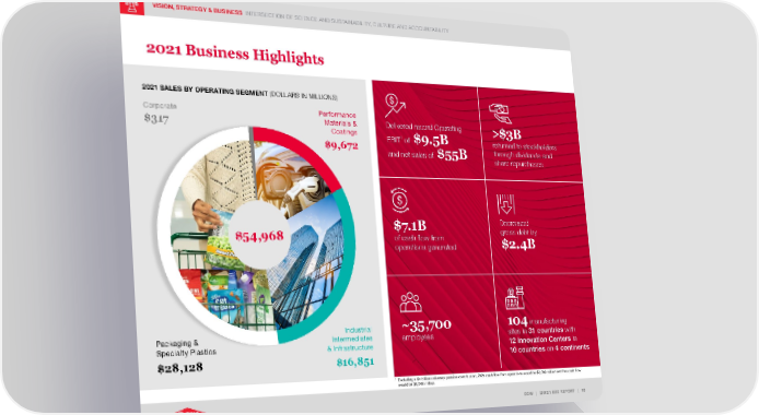 VISION, STRATEGY & BUSINESS INTERSECTION OF SCIENCE AND SUSTAINABILITY, CULTURE AND ACCOUNTABILITY DOW | 2021 ESG REPORT | 10 2021 Business Highlights >$3B r eturned to stockholders through dividends and share repurchases ~35 ,700 e mployees 104 manufacturing sites in 31 countries with 12 Innovation Centers in 10 countries on 4 continents Delivered record Operating EBIT 1 of $9.5B a nd net sales of $55B 1 Excluding a $1 billion voluntary pension contribution, 2021 cash flow fr om operations would be $8,069 million and free cash flow would be $6,568 million. $7.1B o f cash flow from operations generated Decreased gross debt by $2.4B $54,968 Packaging & Specialty Plastics $28,128 Corporate $317 Industrial Intermediates & Infrastructure $16,851 Performance Materials & C oatings $9,672 2021 SALES BY OPERATING SEGMENT (DOLLARS IN MILLIONS)