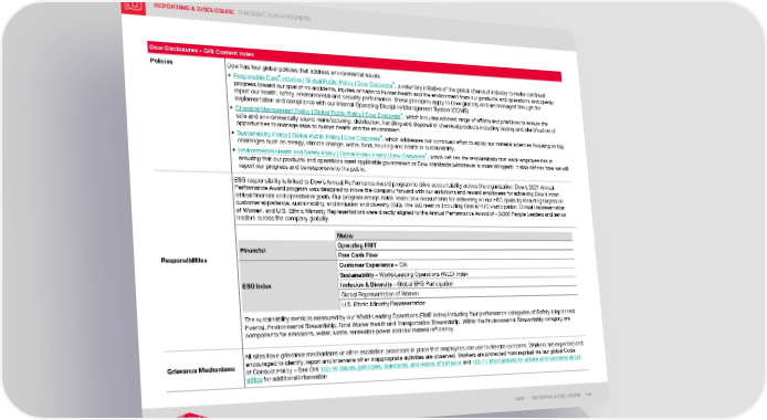 REPORTING & DISCLOSURE TRACKING OUR PROGRESS DOW | REPORTING & DISCLOSURE | 110 Dow Disclosures – GRI Content Index Policies Dow has four global policies that address environmental issues: • Responsible Care ® _ Initiative | Global Public Policy | Dow Corporate , a voluntary initiative of the global chemical industry to make continual progress toward our goal of no accidents, injuries or harm to human health and the environment from our products and operations and openly report our health, safety, environmental and security performance. These principles apply to Dow globally and are managed through the implementation and compliance with our internal Operating Discipline Management System (ODMS). • Chemical Management Policy | Global Public Policy | Dow Corporate , which includes a broad range of efforts and practices to ensure the safe and environmentally sound manufacturing, distribution, handling and disposal of chemical products including testing and identification of opportunities to manage risks to human health and the environment. • Sustainability Policy | Global Public Policy | Dow Corporate , which addresses our continued effort to apply our material sciences focusing on big challenges such as energy, climate change, water, food, housing and health to sustainability. • Environmental Health and Safety Policy | Global Public Policy | Dow Corporate , which defines the responsibility that each employee has in ensuring that our products and operations meet applicable government or Dow standards (whichever is more stringent). It also defines how we will report our progress and be responsive to the public. Responsibilities ESG responsibility is linked to Dow’s Annual Performance Award program to drive accountability across the organization. Dow’s 2021 Annual Performance Award program was designed to move the company forward with our ambitions and reward employees for achieving Dow’s most critical financial and operational goals. Our program design holds Team Dow accountable for delivering on our ESG goals by including targets on customer experience, sustainability, and inclusion and diversity (I&D). The I&D metrics (including Global ERG Participation, Global Representation of Women, and U.S. Ethnic Minority Representation) were directly aligned to the Annual Performance Award of ~3,000 People Leaders and senior leaders across the company globally. Metric Financial Operating EBIT Free Cash Flow ESG Index Customer Experience – CXi Sustainability – World-Leading Operations (WLO) Index Inclusion & Diversity – Global ERG Participation Global Representation of Women U.S. Ethnic Minority Representation The sustainability metric is measured by our World-Leading Operations (RME Index) including four performance categories of Safety (Unplanned Events), Environmental Stewardship, Total Worker Health and Transportation Stewardship. Within the Environmental Stewardship category are components for emissions, water, waste, renewable power and raw material efficiency. Grievance Mechanisms All sites have grievance mechanisms or other escalation processes in place that employees can use to elevate concerns. Workers are expected and encouraged to identify, report and intervene when inappropriate activities are observed. Workers are protected from reprisal via our global Code of Conduct Policy – See GRI 102-16 Values, principles, standards, and norms of behavior and 102-17 Mechanisms for advice and concerns about ethics for additional information.