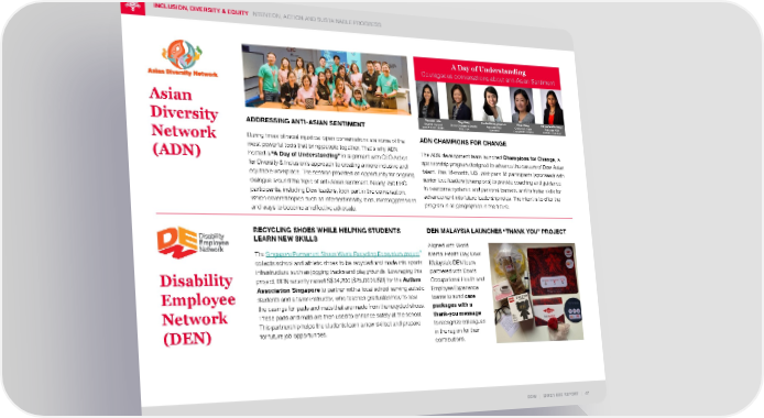 ADDRESSING ANTI-ASIAN SENTIMENT During times of racial injustice, open conversations are some of the most powerful tools that bring people together. That’s why ADN hosted a “A Day of Understanding” in alignment with CEO Action for Diversity & Inclusion’s approach to creating a more inclusive and equitable workplace. The session provided an opportunity for ongoing dialogue around the topic of anti-Asian sentiment. Nearly 750 ERG participants, including Dow leaders, took part in the conversation, which covered topics such as intersectionality, bias, microaggressions and ways to become an effective advocate. ADN CHAMPIONS FOR CHANGE The ADN development team launched Champions for Change , a sponsorship program designed to advance the careers of Dow Asian talent. This 18-month, U.S. pilot pairs 18 participants (sponsees) with senior-level leaders (champions) to provide coaching and guidance to overcome systemic and personal barriers, and to foster skills for advancement into future leadership roles. The intent is to offer the program in all geographies in the future. DOW | 2021 ESG REPORT | 47 INCLUSION, DIVERSITY & EQUITY INTENTION, ACTION AND SUSTAINABLE PROGRESS A Day of Understanding Courageous conversations about anti-Asian Sentiment Tanushri Jain Engineering and Maintenance Leader Ting Jiang Senior Operations Leader Poly 3 NA Eve Suthiwangcharoen Associate R&D Specialist Chun Wang Customs & Trade Compliance Leader Kalyani Martinelango Associate R&D Director, Core R&D RECYCLING SHOES WHILE HELPING STUDENTS LEARN NEW SKILLS The Singapore Permanent Shoes Waste Recycling Ecosystem project collects school and athletic shoes to be recycled and made into sports infrastructure such as jogging tracks and playgrounds. Leveraging this project, DEN recently raised S$34,200 ($25,000 USD) for the Autism Association Singapore to partner with a local school serving autistic students and a tailor-instructor, who teaches graduates how to sew the casings for pads and mats that are made from the recycled shoes. These pads and mats are then used to enhance safety at the school. This partnership helps the students learn a new skillset and prepare for future job opportunities. DEN MALAYSIA LAUNCHES “THANK YOU” PROJECT Aligned with World Mental Health Day, Dow Malaysia’s DEN team partnered with Dow’s Occupational Health and Employee Experience teams to send care packages with a thank-you message to recognize colleagues in the region for their contributions. Asian Diversity Network (ADN) Disability Employee Network (DEN)