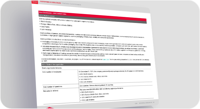 REPORTING & DISCLOSURE TRACKING OUR PROGRESS DOW | REPORTING & DISCLOSURE | 89 Dow Disclosures – GRI Content Index 102-6 Markets served Dow is a global company with product sales in four geographic regions that include: • North America • Europe, Middle East, Africa and India (EMEAI) • Asia Pacific • Latin America Dow’s portfolio of plastics, industrial intermediates, coatings and silicones businesses delivers a broad range of differentiated, science-based products and solutions for its customers in high-growth market segments, such as packaging, infrastructure, mobility and consumer applications. Dow’s portfolio includes these sectors/beneficiaries: • Packa ging & Specialty Plastics serves growing, high-value sectors using world-class technology, broad existing product lines and a rich product pipeline that creates competitive advantages for the entire packaging value chain. The business also serves mobility and transportation, consumer, wire and cable, and construction end markets. • Industrial Intermediates & Infrastructure develops important intermediate chemicals that are essential to manufacturing processes, as well as downstream, customized materials and formulations that use advanced development technologies. These businesses primarily are aligned to market segments as diverse as appliances; coatings; electronics; surfactants for cleaning and sanitization; infrastructure; and oil and gas. • Performance Materials & Coatings serves the needs of the architectural and industrial coatings; home care and personal care; consumer and electronics; mobility and transportation; industrial and chemical processing; and building and infrastructure end markets. For more information, see Item 1. Business, on pages 7-14 of the Dow Inc. Annual Report on Form 10-K ~ for the year ending December 31, 2021, filed with the SEC on February 4, 2022. 102-7 Scale of the organization Dow’s organization includes: Total number of employees On December 31, 2021, the company permanently employed approximately 35,700 people on a full-time basis. • 49% North America • 29% Europe, Middle East, Africa, and India • 14% Asia Pacific • 8% Latin America Total number of operations Dow operates 104 manufacturing sites in 31 countries. Net sales (in millions) Net sales were $54,968 million with the following regional performance: • 36% North America • 36% Europe, Middle East, Africa, and India • 18% Asia Pacific and Latin America • 10% Latin America