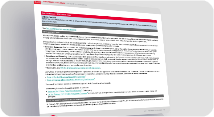 REPORTING & DISCLOSURE TRACKING OUR PROGRESS DOW | REPORTING & DISCLOSURE | 118 Dow Disclosures – GRI Content Index GRI 207: Tax 2019 NOTE: Tax is not a material topic for Dow, as determined by our ESG materiality assessment. We are providing some perspective in this report for those stakeholders who have an interest in this topic. 207-103 Management approach See GRI 103 Management Approach (General) 207-1 Approach to tax We pay taxes globally, making significant contributions to the communities and countries in which we operate. With activity in over 60 countries, we take our obligations seriously and pay substantial income taxes, sales taxes, value added taxes, excise taxes, property taxes and other taxes and duties to local and national governments. Dow’s policy is to be lawful, ethical and socially responsible in all business practices, including our tax policy. Our obligations to stockholders, employees and the communities in which we operate are critical to our success and therefore we are guided by the following tax policy principles: • Economic Substance. Dow’s customers and related market demands determine where we operate, earn profits and therefore where we pay taxes. Proximity to customers and the global supply chain is critical to our ability to operate safely and profitably. Our transfer pricing policies are intended to reflect the economic substance of our global footprint and the activities being performed in each jurisdiction. We undertake transactions for commercial and business purposes, not for the sole purpose of reducing taxation. We interpret the tax laws and regulations with the understanding of the underlying policy and commercial transactions to which they are meant to apply. • Compliance and Reporting. Dow is committed to the highest level of tax compliance and reporting. We file returns, financial statements and disclosures that accurately state our income, costs and other relevant items in all the countries and jurisdictions in which we operate. Compliance means paying the right amount of tax, in the right place, at the right time and involves disclosing all relevant facts and circumstances to the tax authorities and claiming relief and incentives where available. Dow discloses expanded information on revenue, income before taxes and taxes in footnotes to its financial statements. Ever-evolving tax reporting requirements have driven Dow’s ongoing investment in technology enabling improved tax compliance and reporting. • Governance. See GRI 207-2 Tax governance, control and risk management . Dow’s Code of Conduct specifies each employee’s expectations at Dow and our approach to tax aligns with these standards. Furthermore, Dow has a Code of Financial Ethics that applies to the principal executive officer, principal financial officer, principal accounting officer and controllers. Both codes are publicly available here: • Code of Conduct | Business | Legal | Dow Corporate • Code of Financial Ethics | Dow Code of Conduct | Dow Corporate The overall tax strategy and policy are reviewed by Dow’s Audit Committee at least annually. The following information is publicly available on Dow.com: • Trade and Tax | Public Policy | Dow Corporate : Global policy. • UK Tax Strategy 2021 | Public Policy | Dow Corporate This document was developed for the United Kingdom; however, it reflects the company’s global strategy and principles. 207-2 Tax governance, control and risk management At Dow, we have strong internal controls and procedures that govern our tax processes and lower our risk profile, and we have committed the necessary resources to ensure that we are adhering to the highest ethical standards and delivering value to Dow and its stockholders.