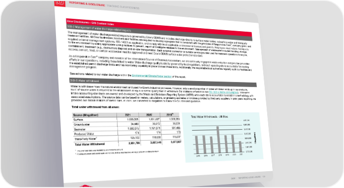 REPORTING & DISCLOSURE TRACKING OUR PROGRESS DOW | REPORTING & DISCLOSURE | 131 Dow Disclosures – GRI Content Index 303-2 Management of water discharge-related impacts The management of water discharge-related impacts is governed by Dow’s ODMS and includes discharge directly to surface water bodies, subsurface water and third-party treatment entities. All Dow businesses, locations and facilities are required to develop a program that is consistent with the principles of Responsible Care ® , company goals, and required external management systems, ISO-14001 as applicable, and comply with local applicable environmental licenses and permits. Employees must reduce the impacts to the environment by using appropriate work practices to prevent, report and mitigate releases to the environment. Management of wastewater includes handling, storage, containment, treatment (e.g., destruction) disposal and on-site transportation. Each external contractor or outside service provider used for treatment operations to recycle, recover, convert, treat, or contain wastewater must be approved and meet Dow’s ODMS surface water protection standard. As a Responsible Care ® company and member of the International Council of Chemical Associations, we are continually engaged in waste reduction and pollution prevention efforts in our operations, including those linked to water. Water discharge quality is strictly governed by local regulations, and each operating site is accountable for meeting the established permit discharge limits and has monitoring capability in place to meet these limits. Additionally, the responsible local authorities regularly audit our facilities and management program. See actions related to our water discharge within the Environmental/Climate/Water section of this report. 303-3 Water withdrawal Water is withdrawn from the natural environment and used for Dow’s industrial processes. However, only a small proportion of water withdrawn ends up in our products. 85% of source water is returned to the environment at equal or better quality than at withdrawal (for additional information see GRI 303-5 Water consumption ). Total water intake accounting standards are owned and developed by the Waste and Emissions Reporting System (WERS) while each site is accountable to establish a methodology with associated assumptions. The source data can be based on meters, calculations, engineering estimates or invoices provided by third party suppliers. In prior years’ reporting, we provided our data in millions of metric tons. In 2021, we converted to megaliters to follow the GRI standard guidance. Total water withdrawal from all areas: Source (Megaliters) 2021 2020 1 2019 1 2,700,000 2,800,000 2,900,000 3,000,000 3,100,000 3,200,000 3,300,000 3,400,000 2021 2020 2019 2018 2017 2016 2015 Megaliters Total Water Withdrawals – All Sites Surface 1,699,905 1,831,697 1,928,351 Groundwater 34,440 35,672 36,231 Seawater 1,092,075 1,101,371 997,485 Produced Water 174 174 173 Third-Party Water 2 125,192 118,532 115,617 Total Water Withdrawal 2,951,786 3,087,446 3,077,857 1 The prior year data was restated by an immaterial amount. 2 Purchased steam and condensate are not included as most facilities are equipped with condensate return.