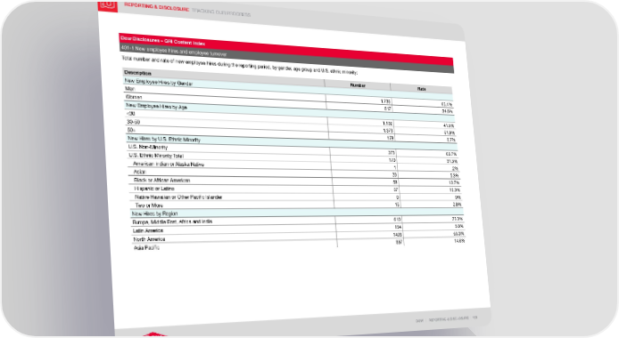 REPORTING & DISCLOSURE TRACKING OUR PROGRESS DOW | REPORTING & DISCLOSURE | 153 Dow Disclosures – GRI Content Index 401-1 New employee hires and employee turnover Total number and rate of new employee hires during the reporting period, by gender, age group and U.S. ethnic minority: Description Number Rate New Employee Hires by Gender Men 1,736 65.4% Women 917 34.6% New Employee Hires by Age <30 1,102 41.5% 30-50 1,373 51.8% 50+ 178 6.7% New Hires by U.S. Ethnic Minority U.S. Non-Minority 373 68.7% U.S. Ethnic Minority Total 170 31.3% American Indian or Alaska Native 1 .2% Asian 29 5.3% Black or African American 58 10.7% Hispanic or Latino 67 12.3% Native Hawaiian or Other Pacific Islander 0 0% Two or More 15 2.8% New Hires by Region Europe, Middle East, Africa and India 619 23.3% Latin America 154 5.8% North America 1493 56.3% Asia Pacific 387 14.6%
