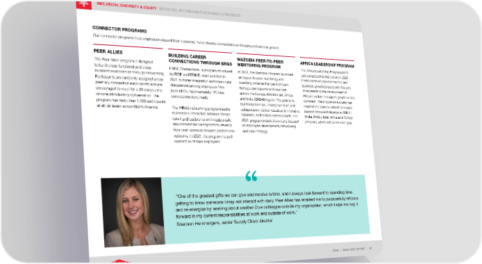 INCLUSION, DIVERSITY & EQUITY INTENTION, ACTION AND SUSTAINABLE PROGRESS DOW | 2021 ESG REPORT | 55 CONNECTOR PROGRAMS Our connector programs help employees expand their networks, foster diverse connections and inspire professional growth. PEER ALLIES The Peer Allies program is designed to build cross-functional and cross- business relationships through networking. Participants are randomly assigned a new peer ally connection each month and are encouraged to meet for a 30-minute one- on-one introductory conversation. The program has more than 1,400 participants at all job levels across North America. BUILDING CAREER CONNECTIONS THROUGH ERGS PRISE Connections, a program structured by RISE and PR!ME, was launched in 2021 to foster integration and meaningful discussions among employees from both ERGs. Approximately 120 new connections were made. The WIN+5 networking program seeks to increase interaction between female talent and leadership and create a safe environment for participants to develop their skills and build broader professional networks. In 2021, the program helped connect 86 female employees. WAZOBIA PEER-TO-PEER MENTORING PROGRAM In 2021, the Wazobia Program launched as a peer-to-peer mentoring and coaching initiative that pairs African- heritage participants with mentors across the Europe, Middle East, Africa and India (EMEAI) region. The goal is to build relationships, strengthen trust and collaboration, deliver robust and innovative solutions, and enable career growth. The 2021 program included sessions focused on employee development, networking and Dow strategy. AFRICA LEADERSHIP PROGRAM The Africa Leadership Program (ALP) just completed its first cohort in 2021. Participants engaged in training and business growth projects with the aim of accelerating the development of African leaders to support growth on the continent. The program’s success has inspired the team to extend its impact beyond Africa and develop an IMEAT (India, Middle East, Africa and Turkey) program, which will launch next year. “One of the greatest gifts we can give and receive is time, and I always look forward to spending time getting to know someone I may not interact with daily. Peer Allies has enabled me to purposefully refocus and re-energize by learning about another Dow colleague outside my organization, which helps me pay it forward in my current responsibilities at work and outside of work.” Shannon Hemmelgarn, senior Supply Chain director