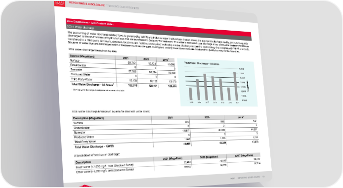 REPORTING & DISCLOSURE TRACKING OUR PROGRESS DOW | REPORTING & DISCLOSURE | 133 Dow Disclosures – GRI Content Index 303-4 Water discharge The accounting of water discharge-related flows is governed by WERS and includes water that has been treated, meets the appropriate discharge quality, and is subsequently discharged to the environment or hydraulic flows that are transferred to 3rd party for treatment. This water is measured upon discharge at our wastewater treatment facilities or transferred to a third party. All Dow businesses, locations and facilities are required to develop a water discharge accounting methodology that complies with WERS standards. Sources of water that are discharged without treatment such as one pass cooling and cooling tower blowdowns are monitored for quality but may not be quantified. Total water discharge breakdown by area: Source (Megaliters) 2021 2020 2019 Total Water Discharge – All Areas 120000 122000 124000 126000 128000 130000 132000 134000 2021 2020 2019 2018 2017 2016 2015 Megaliters Surface 59,742 59,121 55,386 Groundwater 0 0 0 Seawater 57,569 53,284 60,888 Produced Water 0 0 0 Third-Party Water 15,199 13,196 13,170 Total Water Discharge – All Areas 1 132,510 125,601 129,444 1 Dow has water discharges to categories not included in this table. Total water discharge breakdown by area for sites with water stress: Description (Megaliters) 2021 2020 2019 Surface 965 988 942 Groundwater 0 0 0 Seawater 44,511 40,608 44,367 Produced Water 0 0 0 Third-Party Water 1,460 1,633 1,966 Total Water Discharge – KWSS 46,936 43,229 47,275 A breakdown of total water discharge: Description 2021 (Megaliters) 2020 (Megaliters) 2019 (Megaliters) Fresh water (≤1,000 mg/L Total Dissolved Solids) 73,481 70,683 66,590 Other water (>1,000 mg/L Total Dissolved Solids) 59,029 54,918 62,854