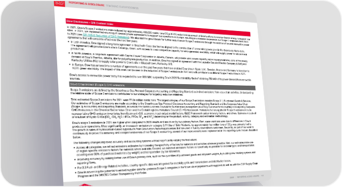 REPORTING & DISCLOSURE TRACKING OUR PROGRESS DOW | REPORTING & DISCLOSURE | 141 Dow Disclosures – GRI Content Index In 2021, Dow’s Scope 2 emissions were reduced by approximately 400,000 metric tons CO 2 e (6.4% reduction) as a result of Dow’s efforts to source cleaner energy to support our sites. In 2021, we implemented sourcing of cleaner power agreements to support our operations in Europe, resulting in a material decrease in our Scope 2 emissions from 2020 to 2021 (see GRI 305-5 Reduction of GHG Emissions ). We also laid the groundwork for further reductions in Scope 2 emissions through the addition of several renewable power agreements that will come into effect over the next few years: • In Latin America, Dow signed a long-term agreement in Brazil with Casa dos Ventos aligned to the construction of a new wind power plant in Rio Grande do Norte state. The agreement will provide Dow’s site in Cabangu, Brazil, with access to cost-competitive capacity for wind-generated electricity, which will supply power for silicon metal production. • In North America, a long-term agreement with Capital Power Corporation in Alberta, Canada, will provide wind power capacity, replacing approximately 40% of the energy demand at Dow’s Prentiss, Alberta, site for polyethylene production. In addition, Dow has signed an agreement with the Louisville Gas and Electric Company (LG&E) and Kentucky Utilities (KU) to supply solar power to Dow’s site in Elizabethtown, Kentucky, U.S. • In Europe, Dow has entered into a number of agreements over the past few years that have enabled Dow sites in Spain, U.K., Sweden, France and Germany to transition to 100% green electricity. The impact of this work can be seen in the reduction of Scope 2 emissions in 2021 and will contribute to additional Scope 2 reductions in 2022. Dow’s access to renewable power today has expanded to over 900 MW, surpassing Dow’s 2025 Sustainability Goal of obtaining 750 MW of its power demand from renewable sources. 305-3 Other indirect (Scope 3) GHG emissions Scope 3 emissions are defined by the Greenhouse Gas Protocol Corporate Accounting and Reporting Standard as indirect emissions from value chain activities. Understanding the relative scale of Scope 3 emissions contributes to our strategies for targeting reduction initiatives. Total estimated Scope 3 emissions for 2021 were 77.64 million metric tons. The largest category of our Scope 3 emissions remains Scope 3.1, Purchased Goods & Services. Our estimates of Scope 3 emissions are made according to the Greenhouse Gas Protocol Corporate Accounting and Reporting Standard and the Corporate Value Chain (Scope 3) Accounting and Reporting Standard, as well as the World Business Council for Sustainable Development (WBCSD) Guidance for Accounting and Reporting Corporate GHG Emissions in the Chemical Sector Value Chain and the Global Logistics Emissions Council (GLEC) Framework. Emissions factors applied in Scope 3 estimates include representative GHG emission inventories from Ecoinvent v3.8, economic input-output model factors, GLEC Framework carbon intensity factors, and others. Estimates include all or a subset of Kyoto GHGs [CO 2 , CH 4 , N 2 O, HFCs, PFCs, SF 6 , and NF 3 ] depending on the product, activity, category and estimation methodology. Dow’s scope 3 emissions in 2021 are higher when compared to 2020 results and are driven by two primary factors. First, some variations were due to differences in Dow’s products or operations. Most significantly, an increase in emissions in category 3.11 Use of Sold Products, by approximately four million tons of CO 2 e was primarily tied to the growth in sales of hydrocarbon-based byproducts from Dow’s manufacturing processes that are used in fuel by downstream customers. Secondly, as part of our work to continuously improve the accuracy and comprehensiveness of our Scope 3 accounting, several of our improvements were implemented in this reporting cycle that are described below. The following changes improved accuracy and accounting systems without significantly varying the final values. • Across all categories, we refined emissions estimates by increasing the specificity of factors for materials and activities wherever possible. First, our estimates make use of region-specific emissions factors for materials where available. Second, we matched emissions factors as specifically as possible for material types and transportation, covering over 90% of purchased materials (by weight) and transportation (by ton-kilometer). • Improving accuracy by making better use of Dow’s primary data, such as the quantities of purchased goods and shipment weights, by building new tracking systems and reporting flows. • For 3.3 Fuel- and Energy-Related Activities, country-specific data was integrated for electricity grids and transmissions and distribution losses. • Dow is advancing the potential to embed supplier data for upstream Scope 3 categories in the future via engagements with suppliers as well as with the CDP Supply Chain Program and the WBCSD Carbon Transparency Pathfinder.
