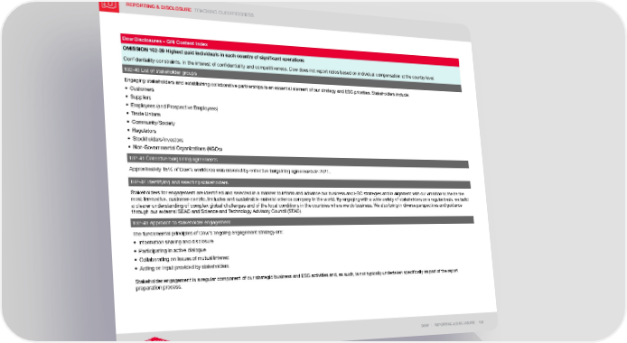REPORTING & DISCLOSURE TRACKING OUR PROGRESS DOW | REPORTING & DISCLOSURE | 102 Dow Disclosures – GRI Content Index OMISSION 102-39 Highest paid individuals in each country of significant operations Confidentiality constraints. In the interest of confidentiality and competitiveness, Dow does not report ratios based on individual compensation at the country level. 102-40 List of stakeholder groups Engaging stakeholders and establishing collaborative partnerships is an essential element of our strategy and ESG priorities. Stakeholders include: • Customers • Suppliers • Employees (and Prospective Employees) • Trade Unions • Community/Society • Regulators • Stockholders/Investors • Non-Governmental Organizations (NGOs) 102-41 Collective bargaining agreements Approximately 15% of Dow’s workforce was covered by collective bargaining agreements in 2021. 102-42 Identifying and selecting stakeholders Stakeholders for engagement are identified and selected in a manner to inform and advance our business and ESG strategies and in alignment with our ambition to the be the most innovative, customer-centric, inclusive and sustainable material science company in the world. By engaging with a wide variety of stakeholders on a regular basis, we build a clearer understanding of complex global challenges and of the local conditions in the countries where we do business. We also bring in diverse perspectives and guidance through our external SEAC and Science and Technology Advisory Council (STAC). 102-43 Approach to stakeholder engagement The fundamental principles of Dow’s ongoing engagement strategy are: • Information sharing and disclosure • Participating in active dialogue • Collaborating on issues of mutual interest • Acting on input provided by stakeholders Stakeholder engagement is a regular component of our strategic business and ESG activities and, as such, is not typically undertaken specifically as part of the report preparation process.