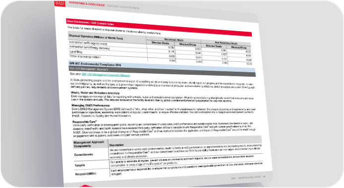 REPORTING & DISCLOSURE TRACKING OUR PROGRESS DOW | REPORTING & DISCLOSURE | 149 Dow Disclosures – GRI Content Index The totals for waste directed to disposal shown in the above table by onsite/offsite: Disposal Operation (Millions of Metric Tons) Hazardous Waste Non-Hazardous Waste Directed Onsite Directed Offsite Directed Onsite Directed Offsite Incineration (w/Energy recovery) 0.235 0.027 0.031 0.007 Incineration (w/o/Energy recovery) 0.175 0.042 0.372 0.013 Landfilling 0.003 0.011 0.157 0.098 Other disposal operations 0.059 0.083 0.069 0.028 GRI 307: Environmental Compliance 2016 307-103 Management Approach See also: GRI 103 Management Approach (General) At Dow, protecting people and the environment is a part of everything we do and every decision we make. We will report our progress and be responsive to the public. To meet our commitments, as well as the laws and government regulations related to environmental protection and remediation to which our global operations are subject, Dow has well- defined policies, requirements and management systems. Waste, Water and Emissions Inventory Dow manages environmental data for reporting with a waste, water and emissions inventory system. All emitting manufacturing sites globally record their emissions and water use in the system annually. The data are reviewed at the facility level and then by global coordinators before being aggregated for corporate reporting. Managing EH&S Performance Dow’s EH&S Management System (EMS) defines the “who, what, when and how” needed for the businesses to implement the company’s policies and requirements, and meet performance objectives, leadership expectations and public commitments. To ensure effective utilization, the EMS is integrated into a companywide management system for EH&S, Operations, Quality and Human Resources. Responsible Care ® Third-party verification and transparent public reporting are cornerstones of world-class EH&S performance and building public trust. Numerous Dow sites in Europe, Latin America, Asia Pacific and North America have received third-party verification of Dow’s compliance with Responsible Care ® and with outside specifications such as ISO- 14001. Dow continues to be a global champion of Responsible Care ® and has worked to broaden the application and impact of Responsible Care ® around the world through engagement with suppliers, customers and joint venture partners. Management Approach Components Description Commitments We are committed to world-class Environmental, Health & Safety (EH&S) performance, as demonstrated by industry-leading results, a long-standing commitment to Responsible Care ® , and our commitment to achieve our 2025 Sustainability Goals and our new targets around advancing a circular economy and climate protection. Targets Our goal is to eliminate all injuries, prevent adverse environmental and health impacts, reduce waste and emissions, and promote resource conservation at every stage of the life cycle of our products. Responsibilities Each employee has a responsibility to ensure that our products and operations meet applicable government or Dow standards, whichever are more stringent.