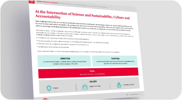 VISION, STRATEGY & BUSINESS INTERSECTION OF SCIENCE AND SUSTAINABILITY, CULTURE AND ACCOUNTABILITY DOW | 2021 ESG REPORT | 7 At the Intersection of Science and Sustainability, Culture and Accountability Many challenges that we face as a society are inextricably interconnected: social inequity, climate change, waste in our oceans, declining biodiversity, and the need for clean water and air among them. By working at the intersections of science and sustainability, culture and accountability, Dow is partnering with others to encourage new thinking and advance ESG priorities that matter to our customers, our employees, our communities and our business success. Our purpose is simple: to deliver a sustainable future for the world through our materials science expertise and in collaboration with our partners. Achieving this purpose is a responsibility we take seriously. In this report, you’ll see how our diverse, dedicated Team Dow is advancing our ambition to be the most innovative, customer-centric, inclusive and sustainable materials science company in the world. We are: • C ollaborating with a wide range of stakeholders to advance environmental stewardship. • C ultivating a culture of inclusion, advancing diversity in our workplace and embedding equity in our practices and processes. • A chieving results through highly principled and socially responsible business practices. • C ontributing to the well-being of our communities. These commitments reflect our culture of operational excellence, high ethical standards, strict financial discipline and transparent risk management. AMBITION To be the most innovative, customer-centric, inclusive and sustainable materials science company in the world GOAL Value growth and best-in-class performance PURPOSE To deliver a sustainable future for the world through our materials science expertise and collaboration with our partners VALUES Integrity Respect for People Protecting our Planet