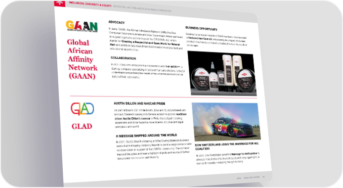 ADVOCACY In June, GAAN, the Women’s Inclusion Network (WIN), the Dow Consumer Solutions business and Dow Government Affairs partnered to support legislative actions to pass the C.R.O.W.N. Act, which stands for Creating a Respectful and Open World for Natural Hair and prohibits race-based hair discrimination in employment and educational opportunities. COLLABORATION In 2021, Dow also announced a collaboration with THE MOST™ , a start-up company specializing in textured hair care solutions, to better understand and address the needs of the underserved multicultural textured hair care market. BUSINESS OPPORTUNITY Leveraging consumer insights of GAAN members, Dow launched a Textured Hair Care Kit , showcasing six uniquely formulated products that have been tested and tailored to meet the needs of consumers. DOW | 2021 ESG REPORT | 48 INCLUSION, DIVERSITY & EQUITY INTENTION, ACTION AND SUSTAINABLE PROGRESS AUSTIN DILLON AND NASCAR PRIDE As part of Dow’s 2021 Pride Month, Dow and GLAD partnered with Richard Childress Racing and General Motors to sponsor NASCAR driver Austin Dillon’s racecar in Pride-themed paint to bring awareness and drive toward a more diverse, inclusive and equal workplace and world. A MESSAGE SHIPPED AROUND THE WORLD In 2021, GLAD, Dow Purchasing and the Coating Materials business worked with shipping company Maersk to paint a cargo container with rainbow colors in support of the LGBTQ+ community. The container traveled the globe and was a highlight of pride and source of further discusssion on inclusion and diversity. DOW SWITZERLAND JOINS THE MARRIAGE FOR ALL COALITION In 2021, Dow Switzerland joined the Marriage for All Coalition to advocate that all should be treated equally and enjoy equal rights at work and in society – including the right to marry. Global African Affinity Network (GAAN) GLAD