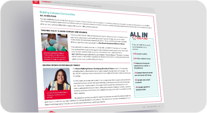 DOW | 2021 ESG REPORT | 68 COMMUNITY INVESTING IN OUR PEOPLE AND PLACES WHERE WE LIVE AND WORK Building Inclusive Communities ALL IN ERG FUND The ALL IN ERG Fund aims to help Dow become the most inclusive materials science company in the world by harnessing the passion, perspective and expertise of our 10 ERGs. The competitive grant program allows our ERGs to work with local organizations to champion inclusion, diversity and equity projects in Dow communities. Since the fund launched in 2019, we have committed $800,000 to support 37 projects in 20 countries worldwide. TEACHING YOUTH TO AVOID CONFLICT AND VIOLENCE Three of our ERGs (GAAN, RISE and WIN) helped students in Belgium engage in interactive science experiments, career sessions and workshops to learn important life skills, such as non-violent communication skills and solving challenging situations. The ALL IN ERG Fund project supported 80 diverse youth from challenging situations at Don Bosco Ganshoren Children’s House . “I was extremely fortunate to work with our GAAN, RISE and WIN ERG members on this project. They volunteered with students from ages 6 to 25 on interactive science experiments, resume and career sessions, and workshops on inclusion and communication,” said Isabelle Dethy, ALL IN ERG Fund project lead and office administrator in Seneffe, Belgium. “We believe this project helped students understand the importance of listening to their emotions, naming their feelings and explaining their needs to avoid conflict and violence.” HELPING WOMEN ENTER SKILLED TRADES The Women Building Futures: Developing Diversity in Trades project in Canada helps unemployed and underemployed women explore careers that pay above a living wage. This ALL IN ERG Fund project was a collaboration between WIN and Canada’s Indigenous Employee Committee. For this project, six women participated in the Journeywoman Start program and connected to career options where women have been historically underrepresented, such as skilled-trades jobs. During the 17-week program, Dow supported living expenses and emergency costs, enabling participants to focus on training. After getting hands-on training in welding, carpentry, plumbing, electrical and mechanics, the graduates are equipped to enter the workforce in their field of expertise. “My experience working as a pipefitter apprentice has been excellent. I’m working toward my goal of getting certified in my trade,” said Iryne Go, Women Building Futures graduate. “My work can be physically demanding, but I am determined to keep going. If you put your mind to it and follow through, anything is possible.” To date, ALL IN ERG Fund projects have achieved the following outcomes: 2,999 people reached 3,084 Dow volunteer hours 20 businesses/nonprofit organizations created or strengthened 409 people improved social and emotional well-being 997 people succeeded in school 360 people gained or sustained jobs Iryne Go, Women Building Futures Journeywoman Start program graduate. Don Bosco Ganshoren Children’s House member participates in an interactive STEM event led by Dow’s GAAN ERG in Belgium in June 2021.