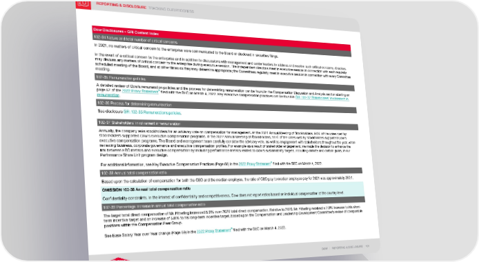 REPORTING & DISCLOSURE TRACKING OUR PROGRESS DOW | REPORTING & DISCLOSURE | 101 Dow Disclosures – GRI Content Index 102-34 Nature and total number of critical concerns In 2021, no matters of critical concern to the enterprise were communicated to the Board or disclosed in securities filings. In the event of a critical concern to the enterprise and in addition to discussions with management and senior leaders to address and resolve such critical concerns, directors may discuss any matters of critical concern to the enterprise during executive session. The independent directors meet in executive session in connection with each regularly scheduled meeting of the Board, and at other times as they may determine appropriate; the Committees regularly meet in executive session in connection with every Committee meeting. 102-35 Remuneration policies A detailed review of Dow’s remuneration policies and the process for determining remuneration can be found in the Compensation Discussion and Analysis section starting on page 57 of the 2022 Proxy Statement filed with the SEC on March 4, 2022. Key executive compensation practices can be found in GRI 102-37 Stakeholders’ involvement in remuneration . 102-36 Process for determining remuneration See disclosure GRI 102-35 Remunerations policies . 102-37 Stakeholders’ involvement in remuneration Annually, the company asks stockholders for an advisory vote on compensation for management. At the 2021 Annual Meeting of Stockholders, 94% of the votes cast by stockholders supported Dow’s executive compensation programs. In the 2022 Annual Meeting of Stockholders, 91% of the votes cast by stockholders supported Dow’s executive compensation programs. The Board and management team carefully consider the advisory vote, as well as engagement with stakeholders throughout the year, when reviewing business, corporate governance and executive compensation profiles. For example as a result of stakeholder engagement, we made the decision to enhance the link between ESG metrics and executive compensation by including performance metrics related to Dow’s sustainability targets, including climate and carbon goals, in our Performance Share Unit program design. For additional information, see Key Executive Compensation Practices (Page 66) in the 2022 Proxy Statement filed with the SEC on March 4, 2022. 102-38 Annual total compensation ratio Based upon the calculation of compensation for both the CEO and the median employee, the ratio of CEO pay to median employee pay for 2021 was approximately 260:1. OMISSION 102-38 Annual total compensation ratio Confidentiality constraints. In the interest of confidentiality and competitiveness, Dow does not report ratios based on individual compensation at the country level. 102-39 Percentage increase in annual total compensation ratio The target total direct compensation of Mr. Fitterling increased 5.9% over 2020 total direct compensation. Relative to 2020, Mr. Fitterling received a 2.9% increase to his short- term incentive target and an increase of 5.8% to his long-term incentive target, based upon the Compensation and Leadership Development Committee’s review of comparable positions within the Compensation Peer Group. See Base Salary Year over Year change (Page 69) in the 2022 Proxy Statement filed with the SEC on March 4, 2022.