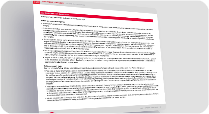 REPORTING & DISCLOSURE TRACKING OUR PROGRESS DOW | REPORTING & DISCLOSURE | 135 Dow Disclosures – GRI Content Index More specifically, we manage biodiversity in the following ways: Within our manufacturing sites • Within Dow’s operations our interactions with biodiversity occur through land use change, water intakes and effluents, air emissions and waste management tied to ecosystem integrity. • In the short- to medium-term timeframe (<10 years), biodiversity impacts are managed through a combination of technological, commercial and operational activities. The management principles governed by Dow’s Operating Discipline Management System are included in order of priority: avoid, reduce, reuse, regenerate, restore and transform. Avoiding new water withdrawals and effluents; reducing emissions contributing to climate impacts by purchasing renewable power; increasing the proportion of water reused both internally and externally; regenerating waste streams to reduce materials sent to landfills; and restoring parcels of lands within our manufacturing assets to native habitats are examples. • As Dow operates mature, capital-intensive assets, biodiversity impacts are also evaluated and managed on long-term timelines (10+ years) by including impacts (+/-) to nature as part of our capital allocation involving multi-decade assessments of water withdrawals; consumption and availability; costs associated with waste generation and treatment; biobased alternatives as raw material sources; regulatory drivers; and technology trends. Long-term, Dow’s management of biodiversity at an asset level involves replacing end-of-life equipment with higher- efficiency, lower-overall-environmental-footprint assets, as well as efforts to scale efficient economical technologies not yet available for widespread deployment today, such as carbon-neutral crackers. • We are taking an ecosystem approach to understand how our manufacturing assets fit within nature. We screen all projects for opportunities to use nature-based solutions that deliver not only the functionalities serving Dow’s purpose but often deliver additional co-benefits to nature and surrounding communities. Finally, we seek to work collectively with our neighbors, recognizing the flow of ecosystem services reaches beyond our properties. • As part of our WLO goals, Dow screens all capital projects for their environmental impacts, including an assessment of the extent of environmental disturbances. Our approach to the reclamation and restoration of lands disturbed by our operations is to adhere to all regional regulatory requirements. All disturbed land is restored to a condition that is appropriate for redevelopment or other reuse. Within our supply chain Dow has initiated efforts in defining potential issue areas and value chain locations for target setting with respect to biodiversity. Key efforts in 2021 include: • Promoting and strengthening best practices associated with biobased raw materials. We have screened 70% of the suppliers in the Latin America region for the use of biologically sourced materials. On a global level such screening initially prioritized the most relevant and high-volume raw materials but will be extended to lower volumes over the next few years. On a global level such screening initially prioritized the most relevant and high-volume raw materials but will be extended to lower volumes over the next few years. We have implemented several check points throughout the product creation cycle to identify biobased raw materials as early as possible. Such measures allow us to investigate the origin of the biobased material, as well as to identify and comply with any relevant national regulatory requirements. Dow colleagues have been trained on the Nagoya Protocol and national regulations on the protection of biodiversity from various functions around the globe: R&D, Legal, Marketing, Sustainability and Intellectual Property. • Initiating the roadmap for integrating biodiversity across Dow’s value chain. Dow’s Consumer Solutions business was chosen as the pilot for its direct extraction of raw materials, manufacturing and commercial activities in Brazil, the most biodiverse country in the world. Timber products, quartz, charcoal, coal and woodchips are raw materials purchased in the market and/or portion produced in our Natural Resources Operation in Brazil. Their management approach includes third-party auditing program of wood and charcoal; a certification of suppliers and Dow land management practices by a third party; a registration of timber production and an annual production/consumption plan administered by the local Secretariat of the Environment. • We are expanding the CDP supply chain program to include biodiversity. The data received will be used to prioritize key issues and specific geographical locations of concern. Ultimately this will enable Dow to design and implement a risk mitigation plan in collaboration with our key suppliers.