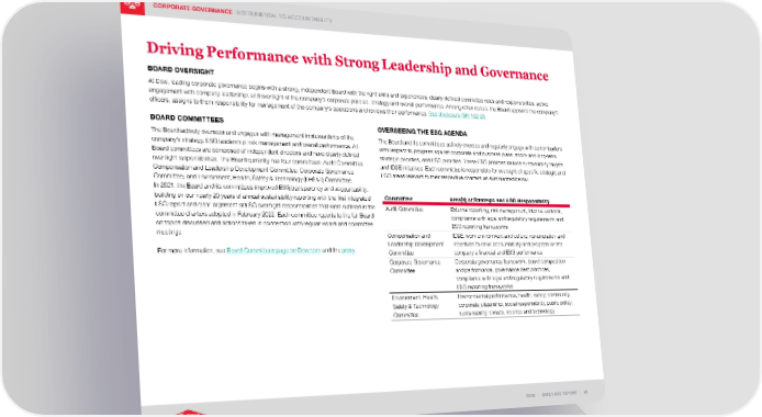 DOW | 2021 ESG REPORT | 76 CORPORATE GOVERNANCE INSTRUMENTAL TO ACCOUNTABILITY Driving Performance with Strong Leadership and Governance BOARD OVERSIGHT At Dow, leading corporate governance begins with a strong, independent Board with the right skills and experiences, clearly defined committee roles and responsibilities, active engagement with company leadership, and oversight of the company’s corporate policies, strategy and overall performance. Among other duties, the Board appoints the company’s officers, assigns to them responsibility for management of the company’s operations and reviews their performance. See disclosure GRI 102-26 . BOARD COMMITTEES The Board actively oversees and engages with management in stewardship of the company’s strategy, ESG leadership, risk management and overall performance. All Board committees are composed of independent directors and have clearly defined oversight responsibilities. The Board currently has four committees: Audit Committee; Compensation and Leadership Development Committee; Corporate Governance Committee; and Environment, Health, Safety & Technology (EHS&T) Committee. In 2021, the Board and its committees improved ESG transparency and accountability, building on our nearly 20 years of annual sustainability reporting with the first integrated ESG report and clear alignment of ESG oversight responsibilities that were outlined in the committee charters adopted in February 2022. Each committee reports to the full Board on topics discussed and actions taken in connection with regular Board and committee meetings. For more information, see Board Committees page on Dow.com and the proxy . OVERSEEING THE ESG AGENDA The Board and its committees actively oversee and regularly engage with senior leaders with respect to progress against corporate and business plans, short- and long-term strategic priorities, and ESG priorities. These ESG priorities include sustainability targets and ID&E initiatives. Each committee is responsible for oversight of specific strategic and ESG areas relevant to their respective charters as summarized below: Committee Area(s) of Strategic and ESG Responsibility Audit Committee External reporting, risk management, internal controls, compliance with legal and regulatory requirements and ESG reporting frameworks Compensation and Leadership Development Committee ID&E, work environment and culture, remuneration and incentives to drive accountability and progress on the company’s financial and ESG performance Corporate Governance Committee Corporate governance framework, board composition and performance, governance best practices, compliance with legal and regulatory requirements and ESG reporting frameworks Environment, Health, Safety & Technology Committee Environmental performance, health, safety, community, corporate citizenship, social responsibility, public policy, sustainability, climate, science and technology