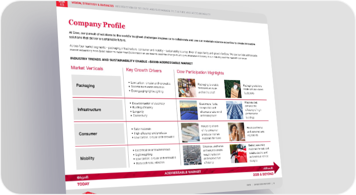 VISION, STRATEGY & BUSINESS INTERSECTION OF SCIENCE AND SUSTAINABILITY, CULTURE AND ACCOUNTABILITY DOW | 2021 ESG REPORT | 9 Company Profile At Dow, our pursuit of solutions to the world’s toughest challenges inspires us to collaborate and use our materials science expertise to create innovative solutions that deliver a sustainable future. Across four market segments – packaging, infrastructure, consumer and mobility – sustainability is a key driver of opportunity and growth for Dow. We see our total addressable market expanding from $650 billion to more than $800 billion as we seek to lead the change to a fully sustainable economy in our industry and the markets we serve. INDUSTRY TRENDS AND SUSTAINABILITY ENABLE >$800B ADDRESSABLE MARKET Market Verticals ADDRESSABLE MARKET Packaging Infrastructure Consumer Mobility Key Growth Drivers Dow Participation Highlights $650B TODAY >$800B 2025 & BEYOND • Lo w carbon, circular and renewable • S ocietal food waste reduction • D owngauging/lightweighting Packaging to enable freshness en route and on the shelf Packaging solutions made with bio-based feedstocks • D ecarbonization of electricity • B uilding efficiency • L ongevity • C onnectivity Elastomers, fluids, composites and silicones enable wind and solar power Materials that enhance the efficiency of high- performance buildings • S afer materials • H igh-efficiency end products • Lo w carbon, circular and renewable Recycling of end- of-life consumer products into raw materials for reuse Bio-based home and personal care ingredients • E lectrification and autonomous • L ightweighting • Lo w carbon, circular and renewable • R educed noise, vibration Silicones, urethanes and acrylics enable weight reduction and improve fuel efficiency Battery assembly materials for safe and reliable electric and autonomous vehicle designs