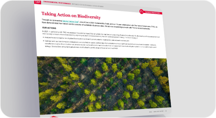 ENVIRONMENTAL PERFORMANCE INROADS FOR SUSTAINABLE DEVELOPMENT DOW | 2021 ESG REPORT | 25 Taking Action on Biodiversity Through our pioneering Valuing Nature Goal , one of Dow’s 2025 Sustainability Goals, and our 10-year collaboration with The Nature Conservancy (TNC), we have demonstrated how nature can be a source of sustainable business value. We are now broadening our work with TNC to include biodiversity. OUR ACTIONS In 2021, in partnership with TNC, we assessed the potential impact that our global sites may have on areas of significance for biodiversity. We developed a land value assessment tool that can help us make informed decisions by exploring solutions and recommending the best land management strategy. The tool is helping us: • Analyze the environmental risk of global Dow locations and identify priority sites for implementing nature-based solutions; and • Optimize land-use transformation strategies at a selected site to capture optimal value from ecosystem services. Land-use transformations such as reforestation, restoration, remediation or wetland construction can provide natural-capital and environmental benefits that can supplement man-made mitigation systems such as carbon capture and storage. Several Dow-owned land parcels were identified as the priority areas to focus our continued work. CLIMATE PROTECTION