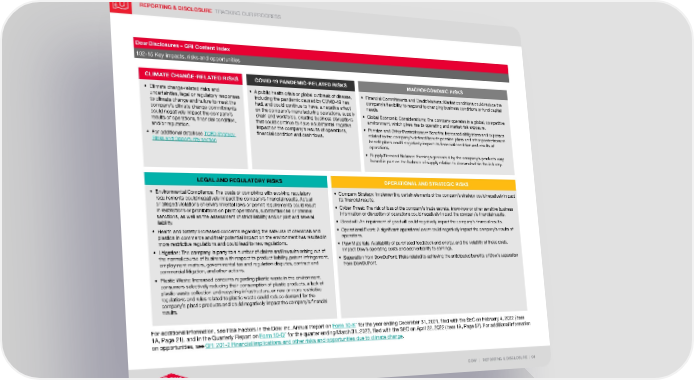 REPORTING & DISCLOSURE TRACKING OUR PROGRESS DOW | REPORTING & DISCLOSURE | 94 Dow Disclosures – GRI Content Index 102-15 Key impacts, risks and opportunities CLIMATE CHANGE-RELATED RISKS COVID-19 PANDEMIC-RELATED RISKS MACROECONOMIC RISKS • Climate change-related risks and uncertainties, legal or regulatory responses to climate change and failure to meet the company’s climate change commitments could negatively impact the company’s results of operations, financial condition, and/or reputation. • For additional detail see TCFD Strategy Risks and Opportunity section • A public health crisis or global outbreak of disease, including the pandemic caused by COVID-19 has had, and could continue to have, a negative effect on the company’s manufacturing operations, supply chain and workforce, creating business disruptions that could continue to have a substantial negative impact on the company’s results of operations, financial condition and cash flows. • Financial Commitments and Credit Markets: Market conditions could reduce the company’s flexibility to respond to changing business conditions or fund capital needs. • Global Economic Considerations: The company operates in a global, competitive environment, which gives rise to operating and market risk exposure. • Pension and Other Postretirement Benefits: Increased obligations and expenses related to the company’s defined benefit pension plans and other postretirement benefit plans could negatively impact its financial condition and results of operations. • Supply/Demand Balance: Earnings generated by the company’s products vary based in part on the balance of supply relative to demand within the industry. LEGAL AND REGULATORY RISKS OPERATIONAL AND STRATEGIC RISKS • Environmental Compliance: The costs of complying with evolving regulatory requirements could negatively impact the company’s financial results. Actual or alleged violations of environmental laws or permit requirements could result in restrictions or prohibitions on plant operations, substantial civil or criminal sanctions, as well as the assessment of strict liability and/or joint and several liability. • Health and Safety: Increased concerns regarding the safe use of chemicals and plastics in commerce and their potential impact on the environment has resulted in more restrictive regulations and could lead to new regulations. • Litigation: The company is party to a number of claims and lawsuits arising out of the normal course of business with respect to product liability, patent infringement, employment matters, governmental tax and regulation disputes, contract and commercial litigation, and other actions. • Plastic Waste: Increased concerns regarding plastic waste in the environment, consumers selectively reducing their consumption of plastic products, a lack of plastic waste collection and recycling infrastructure, or new or more restrictive regulations and rules related to plastic waste could reduce demand for the company’s plastic products and could negatively impact the company’s financial results. • Company Strategy: Implementing certain elements of the company’s strategy could negatively impact its financial results. • Cyber Threat: The risk of loss of the company’s trade secrets, know-how or other sensitive business information or disruption of operations could negatively impact the company’s financial results. • Goodwill: An impairment of goodwill could negatively impact the company’s financial results. • Operational Event: A significant operational event could negatively impact the company’s results of operations. • Raw Materials: Availability of purchased feedstock and energy, and the volatility of these costs, impact Dow’s operating costs and add variability to earnings. • Separation from DowDuPont: Risks related to achieving the anticipated benefits of Dow’s separation from DowDuPont. For additional information, see Risk Factors in the Dow Inc. Annual Report on Form 10-K ~ for the year ending December 31, 2021, filed with the SEC on February 4, 2022 (Item 1A, Page 21), and in the Quarterly Report on Form 10-Q ~ for the quarter ending March 31, 2022, filed with the SEC on April 22, 2022 (Item 1A, Page 57). For additional information on opportunities, see GRI 201-2 Financial implications and other risks and opportunities due to climate change .