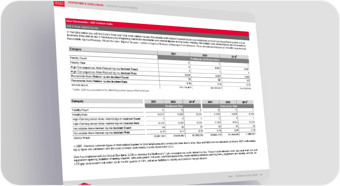 REPORTING & DISCLOSURE TRACKING OUR PROGRESS DOW | REPORTING & DISCLOSURE | 162 Dow Disclosures – GRI Content Index 403-9 Work-related injuries In the table below you will find Dow’s three-year total work-related injuries. Recordable work-related injuries include Dow employees and contractors performing work at Dow locations. Dow stands out in the industry by integrating contractor recordable work-related injuries into its overall tracking. Recordable work-related injuries are considered as Recordable Injuries/Illnesses. Where the term “injuries” is used, it refers to Injuries/Illnesses, unless specified otherwise. Rates are calculated based on 200,000 hours worked. Category 2021 2020 2019 Employees and Contractors Fatality Count 0 1 1 Fatality Rate 0 0.001 0.001 High-Consequences Work-Related Injuries Incident Count 1 1 1 High-Consequences Work-Related Injuries Incident Rate 0.001 0.001 0.001 Recordable Work-Related Injuries Incident Count 99 86 1 127 Recordable Work-Related Injuries Incident Rate 0.14 0.12 0.16 Worker Hours 139,726,491 140,053,502 155,263,916 1 In 2021, a 2020 injury was reclassified from a RWC (Restricted Work Case) to a FAC (First Aid Case). Category 2021 2020 2019 2021 2020 2019 Employees Only Contractors Only Fatality Count 0 0 0 0 1 1 Fatality Rate 0.000 0.000 0.000 0.000 0.003 0.003 High-Consequences Work-Related Injuries Incident Count 1 0 0 0 1 1 High-Consequences Work-Related Injuries Incident Rate 0.003 0.000 0.000 0.000 0.003 0.003 Recordable Work-Related Injuries Incident Count 49 45 68 50 41 59 Recordable Work-Related Injuries Incident Rate 0.12 0.11 0.16 0.16 0.14 0.16 Worker Hours 76,067,581 79,598,857 83,383,059 63,658,910 60,454,645 71,880,857 In 2021, the most common types of work-related injuries for Dow employees and contractors were due to slips, trips and falls from non-elevated conditions. 2021 work-related injury types are consistent with the most common work-related injuries observed in 2020. Dow has implemented Life Critical Standards (LCS) to minimize the likelihood of high-consequences work-related injuries. These include elevated work, electrical work, line and equipment opening, isolation of energy sources, safe work permit, hot work, confined space entry, hydro blasting pressure washing, heavy equipment and moving vehicles. An LCS gap assessment tool, rolled out in the 4th quarter of 2021, will allow facilities to identify and prioritize for gap closure.