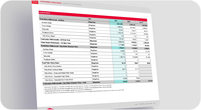 REPORTING & DISCLOSURE TRACKING OUR PROGRESS DOW | REPORTING & DISCLOSURE | 203 Environmental Unit 2021 2020 1 2019 2 Total Water Withdrawal – All Sites Megaliters 2,951,786 3,087,446 3,077,857 Surface Water Megaliters 1,699,905 1,831,697 1,928,351 Groundwater Megaliters 34,440 35,672 36,231 Seawater Megaliters 1,092,075 1,101,371 997,485 Produced Water Megaliters 174 174 173 Third-Party Water 3 Megaliters 125,192 118,532 115,617 Freshwater Withdrawals – All Sites Total Megaliters 1,834,178 1,962,804 2,080,198 Other Water Withdrawals – All Sites Total Megaliters 1,117,608 1,124,643 997,658 Total Water Withdrawal – Key Water-Stressed Sites Megaliters 1,260,831 1,333,885 1,268,031 Surface Water Megaliters 119,698 187,160 247,130 Groundwater Megaliters 614 358 515 Seawater Megaliters 1,086,112 1,095,556 991,862 Produced Water Megaliters 0 0 0 Total Third-Party Water Megaliters 54,137 50,811 28,524 Third-Party Groundwater Megaliters 0 0 Third-Party Surface Water Megaliters 28,778 27,713 Third-Party – Produced Water Fresh Water Megaliters 0 0 Third-Party – Seawater Fresh Water Megaliters 0 0 Third-Party – Seawater Non-Fresh Water Megaliters 25,359 23,098 Freshwater Withdrawals – Key Water-Stressed Sites – Total Megaliters 149,360 215,231 276,169 1 Values listed in the analyst summary table not included in the body of this report are as reported in the 2019 Sustainability Report unless otherwise noted. 2 Values listed in the analyst summary table not included in the body of this report are as reported in the 2020 Sustainability Report unless otherwise noted. 3 Purchased steam and condensate are not included as most facilities are equipped with condensate return. 4 Data collected in 2019 contains all purchased water including from non-freshwater sources. Methodology changes that allowed for visibility of source of third-party water started in 2020.