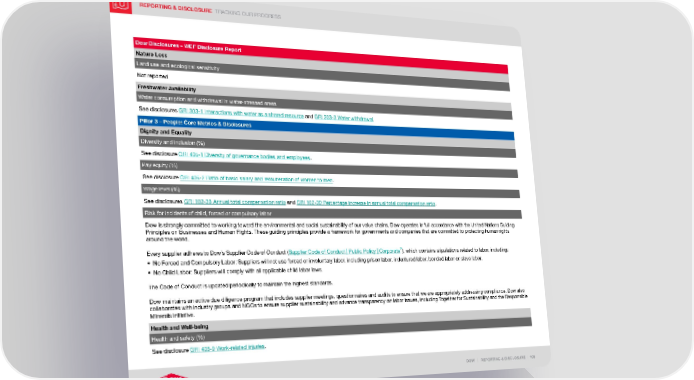 REPORTING & DISCLOSURE TRACKING OUR PROGRESS DOW | REPORTING & DISCLOSURE | 198 Dow Disclosures – WEF Disclosure Report Nature Loss Land use and ecological sensitivity Not reported Freshwater Availability Water consumption and withdrawal in water-stressed areas See disclosures GRI 303-1 Interactions with water as a shared resource and GRI 303-3 Water withdrawal. Pillar 3 – People: Core Metrics & Disclosures Dignity and Equality Diversity and inclusion (%) See disclosure GRI 405-1 Diversity of governance bodies and employees. Pay equity (%) See disclosure GRI 405-2 Ratio of basic salary and remuneration of women to men. Wage level (%) See disclosures GRI 102-38 Annual total compensation ratio and GRI 102-39 Percentage increase in annual total compensation ratio. Risk for incidents of child, forced or compulsory labor Dow is strongly committed to working toward the environmental and social sustainability of our value chains. Dow operates in full accordance with the United Nations Guiding Principles on Businesses and Human Rights. These guiding principles provide a framework for governments and companies that are committed to protecting human rights around the world. Every supplier adheres to Dow’s Supplier Code of Conduct (Supplier Code of Conduct | Public Policy | Corporate ), which contains stipulations related to labor, including: • No Forced and Compulsory Labor: Suppliers will not use forced or involuntary labor, including prison labor, indentured labor, bonded labor or slave labor. • No Child Labor: Suppliers will comply with all applicable child labor laws. The Code of Conduct is updated periodically to maintain the highest standards. Dow maintains an active due diligence program that includes supplier meetings, questionnaires and audits to ensure that we are appropriately addressing compliance. Dow also collaborates with industry groups and NGOs to ensure supplier sustainability and advance transparency on labor issues, including Together for Sustainability and the Responsible Minerals Initiative. Health and Well-being Health and safety (%) See disclosure GRI 403-9 Work-related injuries.