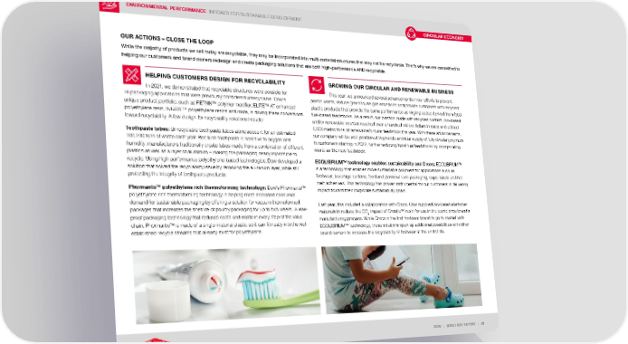 ENVIRONMENTAL PERFORMANCE INROADS FOR SUSTAINABLE DEVELOPMENT DOW | 2021 ESG REPORT | 29 OUR ACTIONS – CLOSE THE LOOP While the majority of products we sell today are recyclable, they may be incorporated into multi-material structures that may not be recyclable. That’s why we are committed to helping our customers and brand owners redesign and create packaging solutions that are both high-performance AND recyclable. HELPING CUSTOMERS DESIGN FOR RECYCLABILITY In 2021, we demonstrated that recyclable structures were possible for 16 packaging applications that were previously considered unrecyclable. Dow’s unique product portfolio, such as RETAIN™ polymer modifier, ELITE™ AT enhanced polyethylene resin, INNATE™ polyethylene resins and more, is driving these conversions toward recyclability. A few design-for-recyclability solutions include: Toothpaste tubes: Unrecyclable toothpaste tubes alone account for an estimated 100,000 tons of waste each year. Because toothpaste is sensitive to oxygen and humidity, manufacturers traditionally create tubes made from a combination of different plastics as well as a layer of aluminum – making the packaging nearly impossible to recycle. Using high-performance polyethylene-based technologies, Dow developed a solution that solved the recyclability issue by removing the aluminum layer, while still protecting the integrity of toothpaste products. Phormanto™ polyethylene rich thermoforming technology: Dow’s Phormanto™ polyethylene rich thermoforming technology is helping meet increased consumer demand for sustainable packaging by offering a solution for vacuum thermoformed packages that increases the shelf life of poultry packaging for up to two weeks. A leak- proof packaging technology that reduces costs and waste in every step of the value chain, Phormanto™ is made of a single-material plastic so it can fit neatly into the well- established recycle streams that already exist for polyethylene. GROWING OUR CIRCULAR AND RENEWABLE BUSINESS This year, we announced several advancements in our efforts to prevent plastic waste, reduce greenhouse gas emissions and provide customers with recycled plastic products that provide the same performance as virgin plastics derived from fossil fuel-based feedstocks. As a result, our plastics made with recycled content, bio-based and/or renewable sources reached over a hundred million dollars in sales and utilized 4,000 metric tons of renewable/circular feedstock this year. With these advancements, our company will be well-positioned to provide an initial supply of fully circular polymers to customers starting in 2022, further reducing fossil fuel feedstocks by incorporating waste as the new feedstock. ECOLIBRIUM™ technology enables sustainability and Crocs: ECOLIBRIUM™ is a technology that enables more sustainable polymers for applications such as footwear, beverage cartons, food and personal care packaging, caps, labels and hot- melt adhesives. This technology has proven instrumental for our customers in delivering impact toward their corporate sustainability goals. Last year, this included a collaboration with Crocs. Dow supplied bio-based elastomer materials to reduce the CO 2 impact of Croslite™ resin for use in the iconic shoe brand’s manufacturing process. While Crocs is the first footwear brand to go to market with ECOLIBRIUM™ technology, these solutions open up additional possibilities with other brand owners to increase the recyclability of footwear at the end of life. CIRCULAR ECONOMY