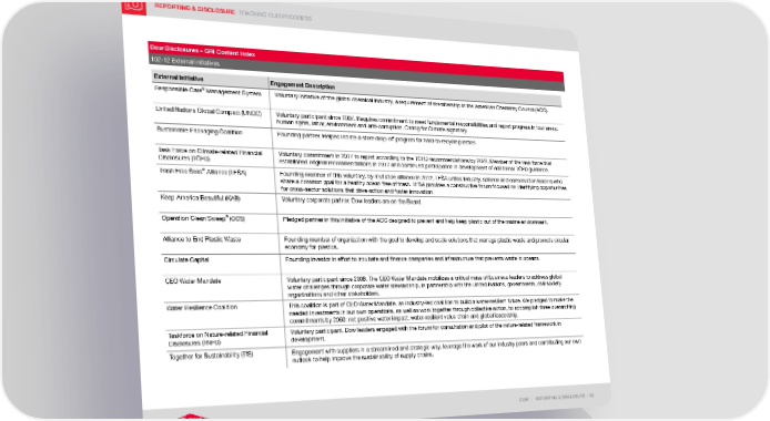 REPORTING & DISCLOSURE TRACKING OUR PROGRESS DOW | REPORTING & DISCLOSURE | 92 Dow Disclosures – GRI Content Index 102-12 External initiatives External Initiative Engagement Description Responsible Care ® Management System Voluntary initiative of the global chemical industry, a requirement of membership in the American Chemistry Council (ACC). United Nations Global Compact (UNGC) Voluntary participant since 2007. Requires commitment to meet fundamental responsibilities and report progress in four areas: human rights, labor, environment and anti-corruption. Caring for Climate signatory. Sustainable Packaging Coalition Founding partner. Helped initiate a store drop-off program for hard-to-recycle plastics. Task Force on Climate-related Financial Disclosures (TCFD) Voluntary commitment in 2017 to report according to the TCFD recommendations by 2022. Member of the task force that established original recommendations in 2017 and continued participation in development of additional TCFD guidance. Trash Free Seas ® Alliance (TFSA) Founding member of this voluntary, by-invitation alliance in 2012. TFSA unites industry, science and conservation leaders who share a common goal for a healthy ocean free of trash. TFSA provides a constructive forum focused on identifying opportunities for cross-sector solutions that drive action and foster innovation. Keep America Beautiful (KAB) Voluntary corporate partner. Dow leaders are on the Board. Operation Clean Sweep ® (OCS) Pledged partner in this initiative of the ACC designed to prevent and help keep plastic out of the marine environment. Alliance to End Plastic Waste Founding member of organization with the goal to develop and scale solutions that manage plastic waste and promote circular economy for plastics. Circulate Capital Founding investor in effort to incubate and finance companies and infrastructure that prevents waste in oceans. CEO Water Mandate Voluntary participant since 2008. The CEO Water Mandate mobilizes a critical mass of business leaders to address global water challenges through corporate water stewardship, in partnership with the United Nations, governments, civil society organizations and other stakeholders. Water Resilience Coalition This coalition is part of CEO Water Mandate, an industry-led coalition to build a water-resilient future. We pledged to make the needed investments in our own operations, as well as work together through collective action, to accomplish three overarching commitments by 2050: net positive water impact, water-resilient value chain and global leadership. Taskforce on Nature-related Financial Disclosures (TNFD) Voluntary participant. Dow leaders engaged with the forum for consultation and pilot of the nature-related framework in development. Together for Sustainability (TfS) Engagement with suppliers in a streamlined and strategic way, leverage the work of our industry peers and contributing our own outlook to help improve the sustainability of supply chains.