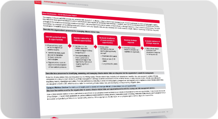 REPORTING & DISCLOSURE TRACKING OUR PROGRESS DOW | REPORTING & DISCLOSURE | 190 Dow Disclosures – TCFD Disclosure Report The results of the annual ERM process are reviewed with Dow’s ELT – a diverse, cross-functional team representing all of Dow’s businesses, functions and geographic regions. Key risks that have specified mitigation actions are reviewed more regularly in leadership team meetings. In addition, risks can be re-evaluated based on several factors including changes in the external and macroeconomic environment, concerns identified by senior leaders or Dow’s Board, or through detection in Dow’s internal work processes. The Audit Committee has oversight of the ERM process and reviews it annually. Specific risks are also reviewed with the Environment, Health, Safety & Technology Committee, Corporate Governance Committee and/or the full Board. Describe the organization’s processes for managing climate-related risks. • Physical risks, such as acute impacts of weather events • Transitional risks, such as cost to transition to lower-emission technologies • Opportunities, such as expansion/development of low-carbon products Identify potential risks & opportunities • Under which timeframe(s) may we see the risk/opportunity emerge? – Short-term (0-5 years) – Medium-term (5-10 years) – Long-term (10+ years) Evaluate timeframe of material risks & opportunities • Utilize climate-related scenarios to test robustness of response to risk/opportunity Evaluate resiliency of strategic response • For risks: in a ‘do nothing’ approach, could the impact to Dow be significant? • For opportunities: is there a potential to take advantage of the opportunity that would result in significant impact? Assess materiality of risks & opportunities • Determine actions needed to mitigate risk/ capitalize on opportunity Develop strategic response Describe how processes for identifying, assessing, and managing climate-related risks are integrated into the organization’s overall risk management. Potential climate-related risks are integrated into the ERM process. Climate-related risks, including both physical and transition risks, are assessed in multiple ERM risk categories including, but not limited to, portfolio management; strategy, business and market choices; external factors including macroeconomic, industry, geopolitical and regulatory trends; operations and safety; financial performance, including investor and rating agency perspectives; and regulatory and compliance actions. Climate-related risks are assigned to Dow’s CST, which is accountable for monitoring climate-related risks and developing and implementing mitigation plans. Category Metrics: Disclose the metrics and targets used to assess and manage relevant climate-related risks and opportunities Disclose the metrics used by the organization to assess climate-related risks and opportunities in line with its strategy and risk management process. Dow utilizes several metrics to track performance and inform on our progress toward addressing our climate and sustainability risks and opportunities. These include disclosures of our Scope 1, 2 and 3 GHG emissions as well as additional metrics related to energy intensity, renewable power and energy, freshwater intake intensity and the alignment of our innovation and product portfolios to our sustainability priorities. Where appropriate, we also report on our progress against defined targets for these metrics.