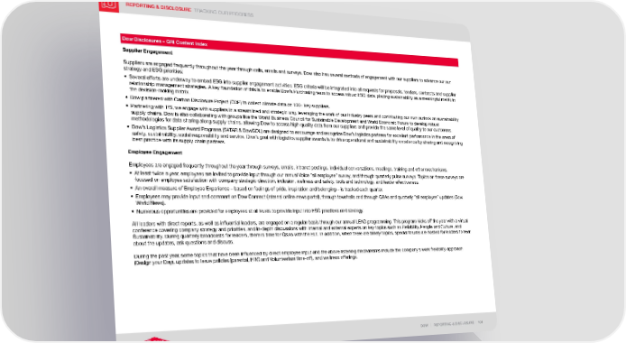 REPORTING & DISCLOSURE TRACKING OUR PROGRESS DOW | REPORTING & DISCLOSURE | 104 Dow Disclosures – GRI Content Index Supplier Engagement Suppliers are engaged frequently throughout the year through calls, emails and surveys. Dow also has several methods of engagement with our suppliers to advance our our strategy and ESG priorities: • Se veral efforts are underway to embed ESG into supplier engagement activities. ESG criteria will be integrated into all requests for proposals, tenders, contracts and supplier relationship management strategies. A key foundation of this is to enable Dow’s Purchasing team to access robust ESG data, placing sustainability as a meaningful metric in the decision-making matrix. • Dow partnered with Carbon Disclosure Project (CDP) to collect climate data on 100+ key suppliers. • Partnering with TfS, we engage with suppliers in a streamlined and strategic way, leveraging the work of our industry peers and contributing our own outlook on sustainability supply chains. Dow is also collaborating with groups like the World Business Council for Sustainable Development and World Economic Forum to develop robust methodologies for data sharing along supply chains, allowing Dow to access high-quality data from our suppliers and provide the same level of quality to our customers. • Dow’s Logistics Supplier Award Programs (S4TAR & DowGOL) are designed to encourage and recognize Dow’s logistics partners for excellent performance in the areas of safety, sustainability, social responsibility and service. Dow’s goal with logistics supplier awards is to drive operational and sustainability excellence by sharing and recognizing best practice with its supply chain partners. Employee Engagement Employees are engaged frequently throughout the year through surveys, emails, intranet postings, individual conversations, meetings, training and other mechanisms. • At least twice a year, employees are invited to provide input through our annual Voice “all employee” survey, and through quarterly pulse surveys. Topics on these surveys are focused on employee satisfaction with company strategic direction, inclusion, wellness and safety, tools and technology, and leader effectiveness. • An overall measure of Employee Experience – based on feelings of pride, inspiration and belonging – is tracked each quarter. • Employees may provide input and comment on Dow Connect (internal online news portal), through townhalls and through Q&As and quarterly “all employee” updates (Dow World News). • Numerous opportunities are provided for employees at all levels to provide input into ESG practices and strategy. All leaders with direct reports, as well as influential leaders, are engaged on a regular basis through our annual LEAD programming. This program kicks off the year with a virtual conference covering company strategy and priorities, and in-depth discussions with internal and external experts on key topics such as Reliability, People and Culture, and Sustainability. During quarterly broadcasts for leaders, there is time for Q&As with the ELT. In addition, when there are timely topics, special forums are hosted for leaders to hear about the updates, ask questions and discuss. During the past year, some topics that have been influenced by direct employee input and the above listening mechanisms include the company’s work flexibility approach (Design your Day), updates to leave policies (parental, ERG and Volunteerism time-off), and wellness offerings.