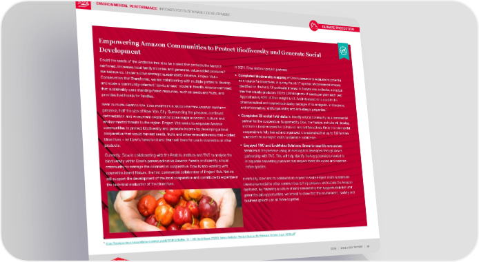 ENVIRONMENTAL PERFORMANCE INROADS FOR SUSTAINABLE DEVELOPMENT DOW | 2021 ESG REPORT | 26 Empowering Amazon Communities to Protect Biodiversity and Generate Social Development Could the seeds of the Andiroba tree also be a seed that protects the Amazon rainforest, increases local family incomes and generates value-added products? We believe so. Under a Dow strategic sustainability initiative, Project Ybá – Conservation that Transforms, we are collaborating with multiple parties to develop and scale a community-oriented “bio-business” model in Brazil’s Amazon rainforest that sustainably uses standing-forest resources, such as seeds and fruits, and provides livelihoods for families. Near our Breu Branco site, Dow maintains a 38,000-hectare Amazon rainforest preserve, half the size of New York City. Surrounding the preserve, continued deforestation and ecosystem degradation pose major economic, cultural and environmental threats to the region. Project Ybá seeks to empower Amazon communities to protect biodiversity and generate income by developing a local cooperative that would harvest seeds, fruits and other renewable resources – called bioactives – on Dow’s forestland and then sell them for use in cosmetics or other products. Currently, Dow is collaborating with the Peabiru Institute and TNC to analyze the biodiversity within Dow’s preserved native Amazon forests and identify a local community to manage the commercial cooperative. Dow is also working with cosmetics brand Natura, the first commercial collaborator of Project Ybá. Natura will support the development of the local cooperative and contribute its expertise in the technical evaluation of the bioactives. In 2021, Dow and our project partners: • Completed biodiversity mapping of Dow’s preserve to evaluate its potential as a source for bioactives. A survey found 17 species of commercial interest identified on the land. Of particular interest to Natura was andiroba, a tropical tree that usually produces 180 to 200 kilograms of seeds per plant each year. Approximately 60% of their weight is oil. Andiroba seed oil is used in the pharmaceutical and cosmetics industry because of its analgesic, antibacterial, anti-inflammatory, antifungal ability and anti-allergic properties. 1 • Completed 22 social field visits to identify a local community as a commercial partner for the cooperative. Supported by Dow, the Peabiru Institute will develop and train a local cooperative to harvest and sell bioactives. Once the commercial cooperative is fully trained and organized, it is estimated that up to 150 families will benefit from Project Ybá’s sustainable commerce. • Engaged TNC and EcoMetrix Solutions Group to quantify ecosystem services at the preserve using an existing tool developed through Dow’s partnership with TNC. This will help identify the key parameters needed to incorporate harvesting practices that respect forest life cycles and maintain native species. Eventually, Dow and its collaborators expect to scale Project Ybá’s sustainable commerce model to other communities to help preserve and restore the Amazon rainforest. By fostering a culture of land stewardship that supports inclusion and generates job opportunities, we intend to show that the environment, society and business growth can all thrive together. 1 https://bioresources.cnr.ncsu.edu/wp-content/uploads/2019/12/BioRes_15_1_894_SodreSouza_PFODQ_Valoriz_Andiroba_Residue_Optimiz_Alk_Pretreatm_Ferment_Sugar_16508.pdf CLIMATE PROTECTION
