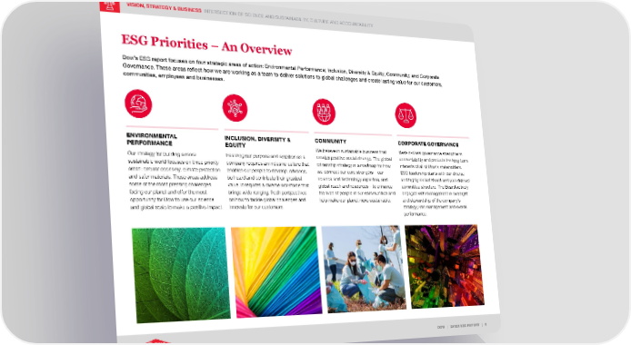 VISION, STRATEGY & BUSINESS INTERSECTION OF SCIENCE AND SUSTAINABILITY, CULTURE AND ACCOUNTABILITY DOW | 2021 ESG REPORT | 8 ESG Priorities – An Overview Dow’s ESG report focuses on four strategic areas of action: Environmental Performance; Inclusion, Diversity & Equity; Community; and Corporate Governance. These areas reflect how we are working as a team to deliver solutions to global challenges and create lasting value for our customers, communities, employees and businesses. ENVIRONMENTAL PERFORMANCE Our strategy for building a more sustainable world focuses on three priority areas: circular economy, climate protection and safer materials. These areas address some of the most pressing challenges facing our planet and offer the most opportunity for Dow to use our science and global scale to make a positive impact. COMMUNITY We believe in sustainable business that creates positive social change. The global citizenship strategy is a roadmap for how we connect our core strengths – our science and technology expertise, and global reach and resources – to enhance the lives of people in our communities and help make our planet more sustainable. INCLUSION, DIVERSITY & EQUITY Realizing our purpose and ambition as a company requires an inclusive culture that enables our people to develop, advance, be heard and contribute their greatest value. It requires a diverse workforce that brings wide-ranging, fresh perspectives on how to tackle global challenges and innovate for our customers. CORPORATE GOVERNANCE Best-in-class governance strengthens accountability and protects the long-term interests of all of Dow’s stakeholders. ESG leadership starts with our diverse and highly skilled Board and well-defined committee structure. The Board actively engages with management in oversight and stewardship of the company’s strategy, risk management and overall performance.