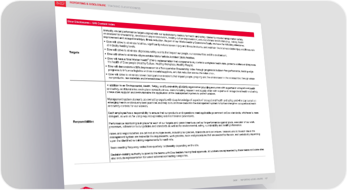 REPORTING & DISCLOSURE TRACKING OUR PROGRESS DOW | REPORTING & DISCLOSURE | 157 Dow Disclosures – GRI Content Index Targets Annually, we set performance targets aligned with our sustainability metrics for health and safety. Elements include transportation safety, environmental stewardship, decrease in unplanned events, healthy culture improvement, reduced chronic health risks (e.g., noise), health improvement and occupational injury illness reduction. As part of our World-Leading Operations Goals, we have the following milestones: • Dow will strive to eliminate fatalities, significantly reduce severe injury and illness incidents, and maintain the total recordable injury and illness rate at industry-leading levels. • Dow will strive to eliminate all process safety events that impact our people, our communities and the environment. • Dow will strive to eliminate all preventable Motor Vehicle Accident (MVA) fatalities. • Dow will have a Total Worker Health ® (TWH) implementation that comprehensively controls workplace health risks, protects workers and improves the health of Dow people (Healthy Culture, Healthy Workplace, Healthy People). • Dow will demonstrate a 50% improvement in a Transportation Stewardship Index through progress in incident-free performance, leading-edge programs to influence logistics and raw material suppliers, and risk reduction across the value chain. • Dow will strive to eliminate severe transportation incidents that impact people, property and the environment in the communities through which our products, raw materials and intermediates flow. Responsibilities In addition to an Environmental, Health, Safety, and Sustainability (EHS&S) organization providing resources with expertise in occupational health and safety, additional roles are in place across business, manufacturing, research and supply chain with expertise in occupational health and safety. These roles support and institutionalize the application of the management system to protect workers. Management system elements are owned by experts with deep knowledge of aspects of occupational health and safety and who stay current on emerging trends and industry best practices and help to build those back into the management system to further strengthen occupational health and safety controls for our workers. Each employee has a responsibility to ensure that our products and operations meet applicable government or Dow standards, whichever is more stringent, as well as for using required operating and maintenance procedures. Performance monitoring is in place for each of our targets and commitments as well as for performance against goals, execution of our work processes, adherence to our policies and standards as well as for environmental, safety, sustainability and health performance. Roles and responsibilities are defined at multiple levels, including our policies, standards and procedures. Workers who fulfill each role in the management system are trained in the requirements, work process, tools and procedures that are needed for the role, and periodically depending upon the identified re-training requirements for each role. Team meeting frequency varies from quarterly to biweekly depending on the site. Decision-making authority is given to the teams with Dow leaders having final approvals. All workers are represented by these teams and some sites also include representation for select external contracting companies.