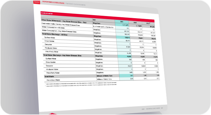 REPORTING & DISCLOSURE TRACKING OUR PROGRESS DOW | REPORTING & DISCLOSURE | 204 Environmental Unit 2021 2020 1 2019 2 Other Water Withdrawals – Key Water-Stressed Sites – Total Megaliters 1,111,471 1,118,654 991,862 Freshwater Intake Intensity, Key Water-Stressed Sites lb. of water per lb. of production 4.5 6.1 6.7 Water Consumption – All Areas Megaliters 442,768 463,117 461,678 Water Consumption – Key Water-Stressed Sites Megaliters 189,125 200,083 190,205 Total Water Discharge – All Sites Megaliters 132,510 125,601 129,443 Surface Water Megaliters 59,742 59,121 55,386 Groundwater Megaliters 0 0 0 Seawater Megaliters 57,569 53,284 60,688 Produced Water Megaliters 0 0 0 Third-Party Water Megaliters 15,199 13,196 13,170 Total Water Discharge – Key Water-Stressed Sites Megaliters 46,936 43,229 47,275 Surface Water Megaliters 965 988 942 Groundwater Megaliters 0 0 0 Seawater Megaliters 44,511 40,608 44,367 Produced Water Megaliters 0 0 0 Third-Party Water Megaliters 1,460 1,633 1,966 Total Waste Millions of Metric Tons 1.41 1.38 1.43 Hazardous Waste Millions of Metric Tons 0.64 0.67 0.72 1 Values listed in the analyst summary table not included in the body of this report are as reported in the 2019 Sustainability Report unless otherwise noted. 2 Values listed in the analyst summary table not included in the body of this report are as reported in the 2020 Sustainability Report unless otherwise noted.