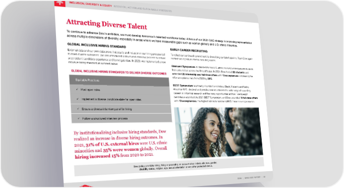 INCLUSION, DIVERSITY & EQUITY INTENTION, ACTION AND SUSTAINABLE PROGRESS DOW | 2021 ESG REPORT | 52 Attracting Diverse Talent To continue to advance Dow’s ambition, we must develop tomorrow’s talented workforce today. A focus of our 2025 ID&E strategy is improving representation across multiple dimensions of diversity, especially in areas where we have measurable gaps such as women globally and U.S. ethnic minorities. GLOBAL INCLUSIVE HIRING STANDARD External data and our own data prove that equity and inclusion in our hiring process led to more diverse outcomes. We also introduced a structured interview process to ensure a consistent candidate experience and to mitigate bias. In 2020, we implemented a new inclusive hiring standard as outlined below. EARLY-CAREER RECRUITING To reflect our continued commitment to diversifying our talent pipeline, Team Dow again hosted two signature internal recruiting events. Diamond Symposium is intended for top U.S. ethnic minority undergraduate students from universities across the United States. In 2021, Dow hosted 53 students and extended 25 internship and full-time offers with 15 acceptances – increasing the offer acceptance rate from 2020 by 36% . BEST Symposium is primarily intended to introduce Black, Hispanic and Native American U.S. doctoral and postdoctoral scientists to the wide range of rewarding careers in industrial research and the many opportunities at Dow. Twenty-eight candidates attended the 2021 BEST Symposium, and Dow extended 16 full-time offers with 13 acceptances , the highest absolute number of BEST hires in a single season. GLOBAL INCLUSIVE HIRING STANDARDS TO DELIVER DIVERSE OUTCOMES Equitable Practices Post open roles Implement a diverse candidate slate for open roles Ensure a diverse interview panel for hiring Follow a structured interview process Dow policy prohibits hiring, firing or promoting on account of an individual’s race, gender, disability status, religion, age, sexual orientation or any other protected status. By institutionalizing inclusive hiring standards, Dow realized an increase in diverse hiring outcomes. In 2021, 31% of U.S. external hires were U.S. ethnic minorities and 35% were women globally. Overall hiring increased 15% from 2020 to 2021.